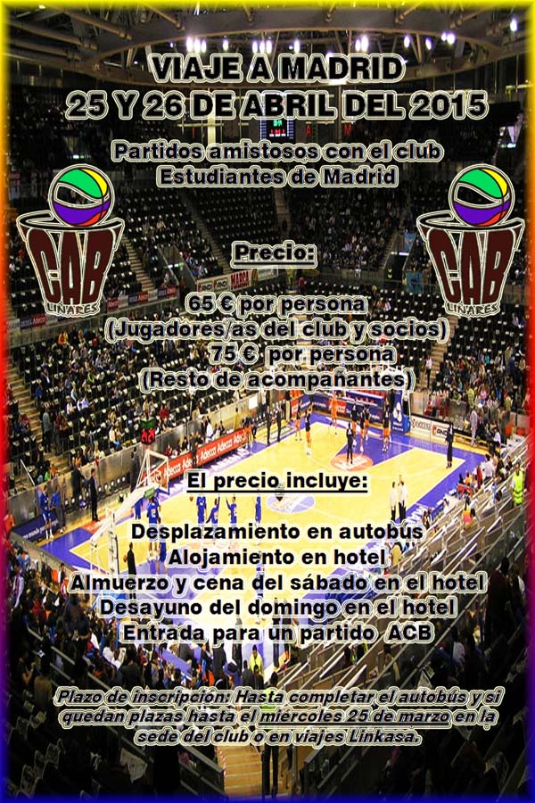El fin de semana comprendido del 25 al 26 de abril vamos a realizar un viaje a Madrid para diputar encuentros amistosos con el Club Estudiantes y otros clubes de la comunidad madrileña y aprovecharemos para presenciar un encuentro de Liga ACB del Club Estudiantes de Madrid.