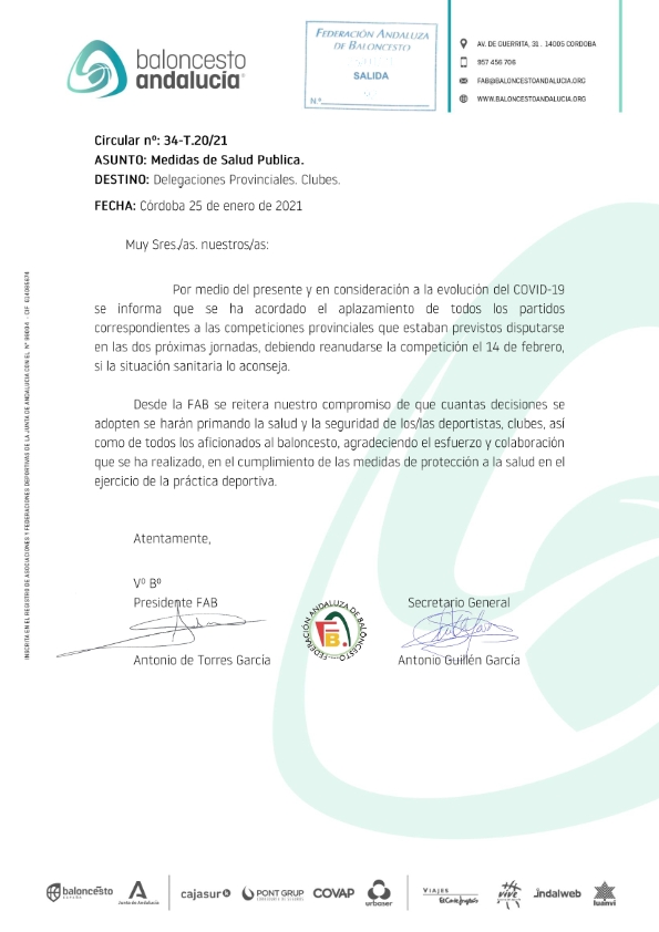 La Federación Andaluza de Baloncesto ha emitido en el día de hoy una circular en la que se comunica la decisión de aplazar todos los encuentros de competiciones provinciales previstos para las dos próximas jornadas, reanudándose la competición si la situación sanitaria lo aconseja a partir del día 14 de febrero.