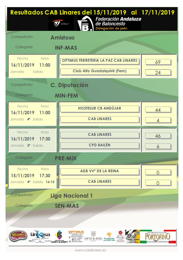 El sábado por la mañana el mini femenino caía derrotado de forma abultada ante CB Andújar en su visita a tierras iliturgitanas. El infantil masculino Optimus Ferretería La Paz CAB Linares vencía al infantil femenino de Club Alto Guadalquivir al que agradecemos su visita para este partido amistoso. El cadete masculino Ristorante Portofino CAB Linares vencía en el derbi local a Linabasket Negro.