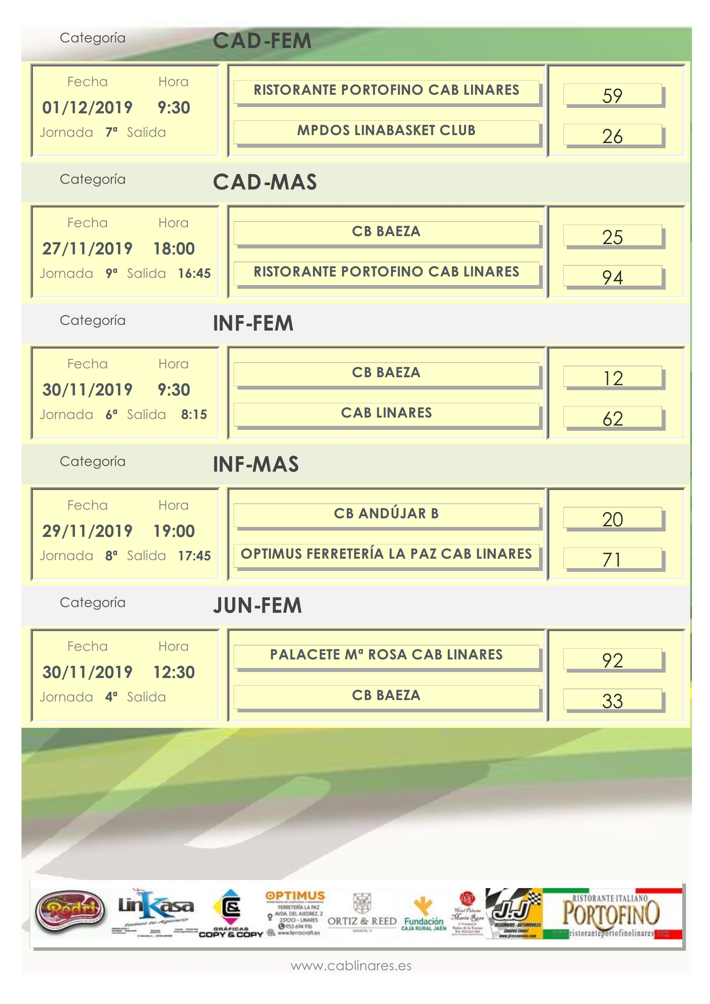 El miércoles por la tarde iniciaba la jornada el cadete masculino Ristorante Portofino CAB Linares que viajaba a Úbeda donde resolvía sin problemas su encuentro de liga regular. El viernes por la tarde el mini femenino vencía en el partido de cuartos de final de la Copa Diputación a CB Baeza y el infantil masculino Optimus Ferretería La Paz CAB Linares no abandonaba la senda del triunfo en su enfrentamiento con el equipo B de CB Andújar, que le hace mantenerse invicto hasta este momento de la competición provincial.