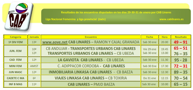 Por la tarde, las chicas mini se desplaaban a Córdoba a disputar un encuentro amistoso ante Addipacor, en el que caían claramente derrotadas y cerraba la jornada del sábado el equipo de 1ª Nacional Femenina www.aove.net CAB Linares que caía derrotado ante Ramón y Cajal de Granada.