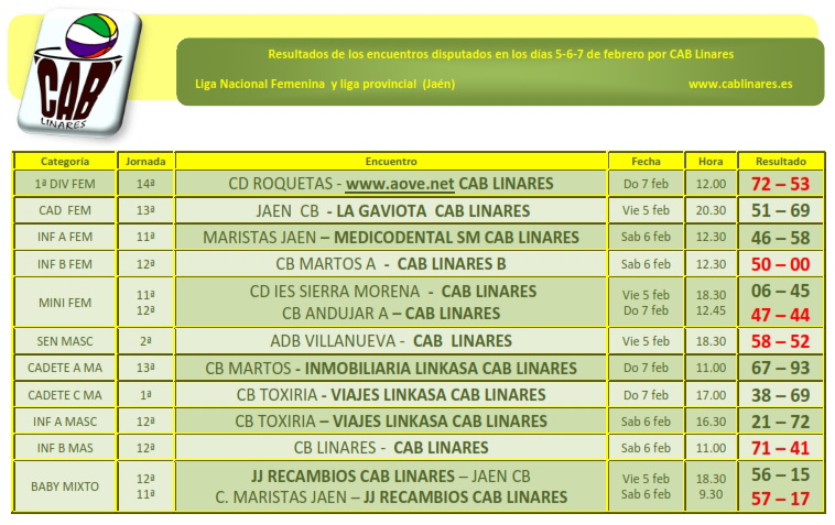 El mini femenino visitaba al equipo A de CB Andújar, partido en el caía derrotado en un apretado final y nuestro equipo de 1ª Nacional Femenina www.aove.net CAB Linares caía derrotado en su visita a Roquetas.