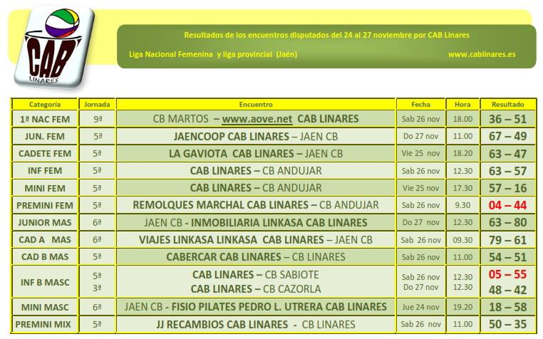 La mañana del sábado venía cargada de encuentros. En el apartado masculino, victorias del cadete masculino A Viajes Linkasa CAB Linares ante Jaén CB, uno de los rivales directos por el título provincial, victoria del cadete masculino B, Carbecar CAB Linares en el derby local en un partido en el que tras ir siempre por detrás en el electrónico, los chicos de Eusebio lograban imponerse en un final apretado y derrota del infantil masculino B ante un CB Sabiote mucho más físico y experimentado que los pupilos de Adrián. En el apartado femenino, derrota de las preminis de Nuria ante un buen equipo como el de CB Andújar y victoria del infantil de Isra, que en un difícil partido, se imponía por una corta diferencia a las chicas de CB Andújar. Finalmente nuestro premini mixto vencía en el segundo derby local de la jornada en partido disputado en el Pabellón Andalucía.