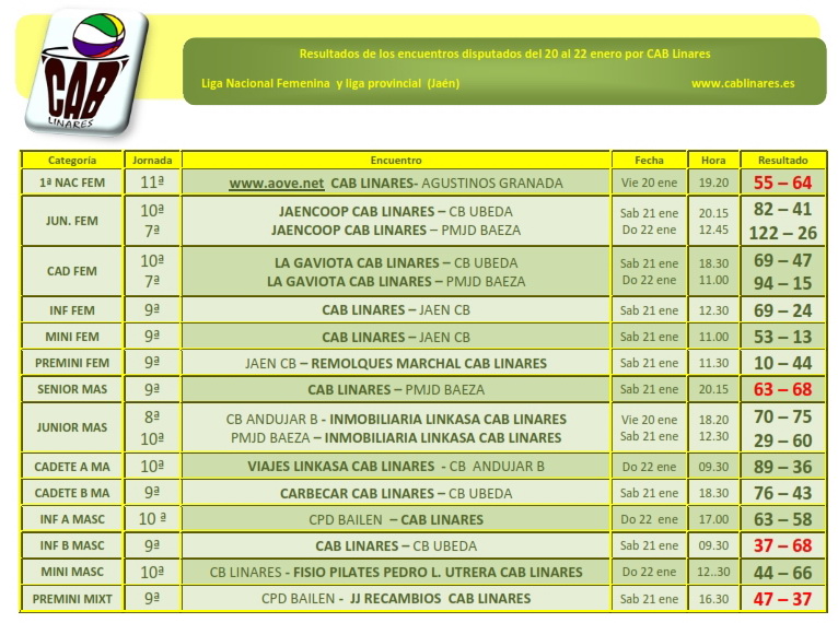 El domingo por la mañana el cadete masculino A Viajes Linkasa CAB Linares se deshacía sin dificultad de CB Andújar B en partido disputado en el Julián. En el Huarte, el cadete femenino La Gaviota CAB Linares vencía a Baeza en partido aplazado. Igual resultado de las junior del JAENCOOP CAB Linares ante las baezanas, que cierran así la primera vuelta que aún tenía pendiente este encuentro. El mini masculino Fisio Pilates Pedro L. Utrera CAB Linares se imponía en el derbi local en un partido muy disputado y con gran ambiente en las gradas. Importante victoria de los chicos de José M. García, que en la práctica aseguran su primera posición en la segunda vuelta de la competición, lo que les permite actuar de locales toda la tercera vuelta de la misma y tomar una ventaja importante con respecto a sus rivales de cara a la clasificación final.