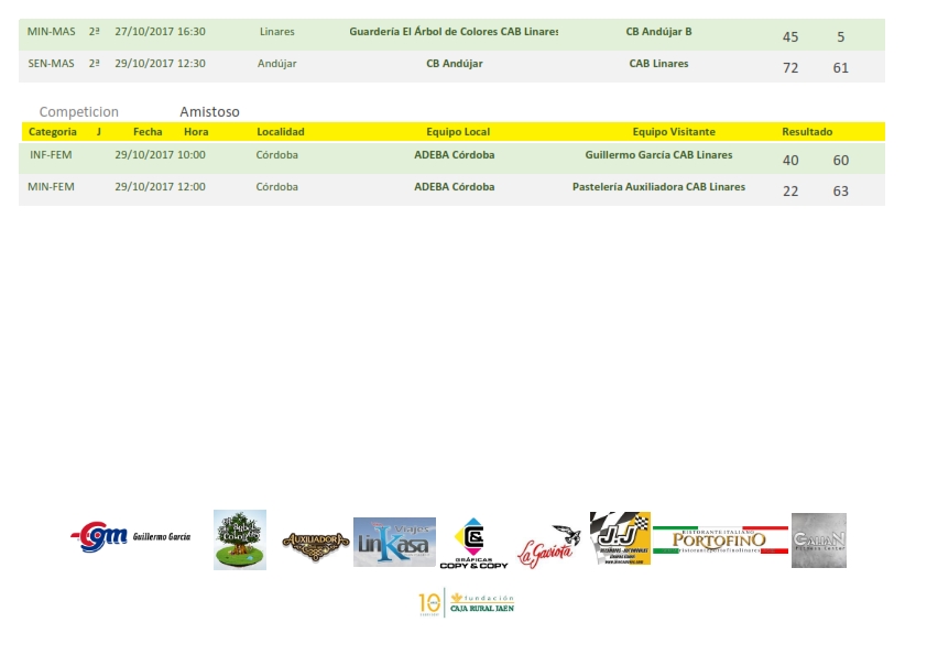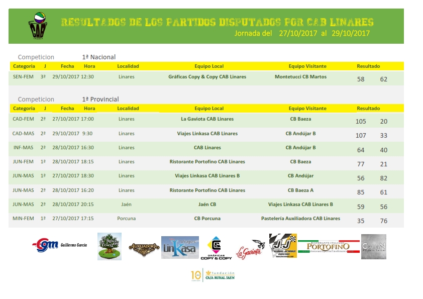 En la jornada de domingo el cadete masculino A, Viajes Linkasa CAB Linares se deshacía del equipo B de CB Andújar en partido disputado en el Pabellón Huarte a primera hora de la mañana. El infantil femenino Guillermo García CAB Linares se desplazaba a Córdoba a disputar un encuentro de carácter amistoso ante ADEBA en el que acabó venciendo. El mini femenino Pastelería Auxiliadora CAB Linares también viajaba a Córdoba y caía en el amistoso claramente ante el anfitrión ADEBA Córdoba. Los dos equipos senior del club caían derrotados, el equipo de 1ª Nacional Femenina Gráficas Copy & Copy CAB Linares, ante CB Martos y el masculino en su visita a la pista de CB Andújar en la competición provincial.