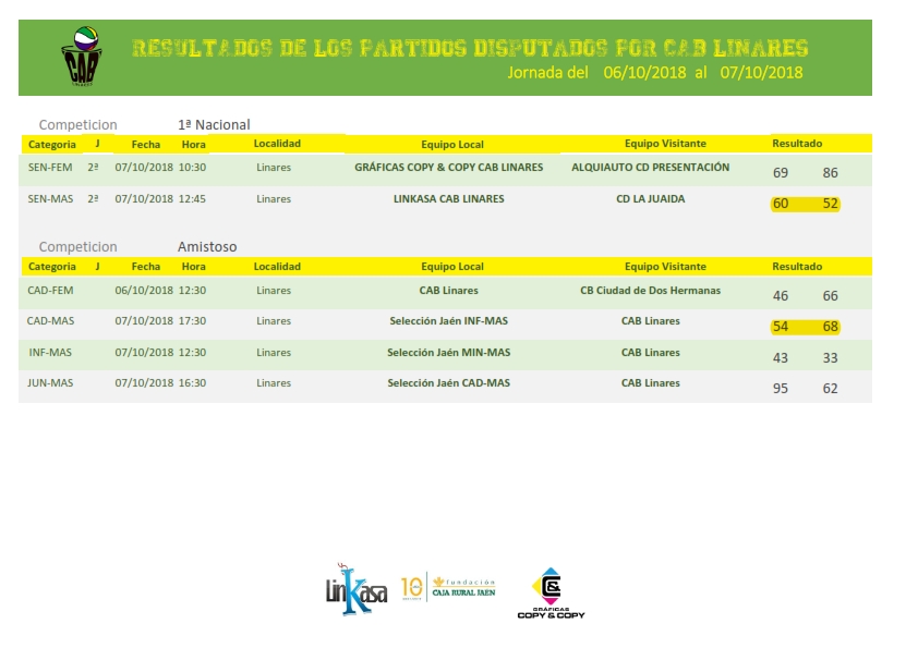 Segunda jornada de competición en 1ª Nacional, tanto masculina como femenina, en la que nuestros equipos jugaron ambos como locales en la mañana del domingo en el Pabellón Julián Jiménez y en la que hubo cara y cruz. Derrota en el primer partido de las chicas del Gráficas Copy & Copy CAB Linares, que caían ante CD Presentación de Granada y victoria de los chicos de Linkasa CAB Linares ante CD La Juaida, en la que es la primera victoria de nuestro equipo en categoría nacional.