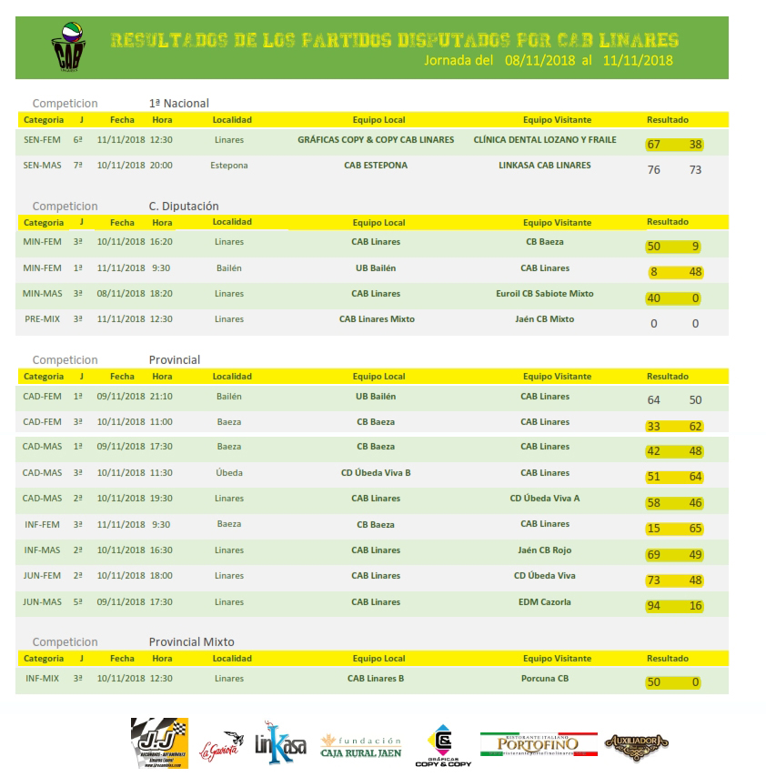 En la tarde del viernes, el junior masculno, Linkasa CAB Linares se imponía sin dificultad a EMD Cazorla en partido correspondiente a la quinta jornada de competición. El cadete masculino, Ristorante Portofino CAB Linares, comenzaba su complicado fin de semana de partidos imponiéndose a domicilio en su visita a Baeza, en partido aplazado correspondiente a la primera jornada. El cadete femenino disputaba un importante partido de cara a la clasificación final en Bailén, donde caían derrotadas por catorce puntos en un mal partido de las chicas de Rosa y Olga, lo cual pone difícil el clasificarse como primero al final de la liga regular de la categoría.