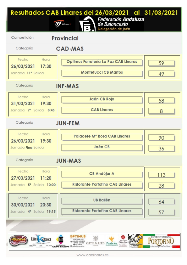 Ya en la jornada de sábado, el junior masculino Ristorante Portofino CAB Linares cosechaba su primera derrota en esta jornada ante el equipo A de CB Andújar. El martes disputaban su partido aplazado ante UB Bailén, partido en el que caían derrotados en tierras bailenenses.