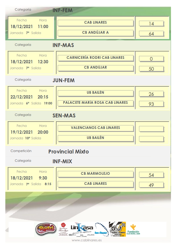 Última jornada de competición de este año 2021 que nos deja resultados dispares en las competiciones provinciales. El equipo de LN1 Femenina Linkasa CAB Linares descansaba por calendario esta jornada.