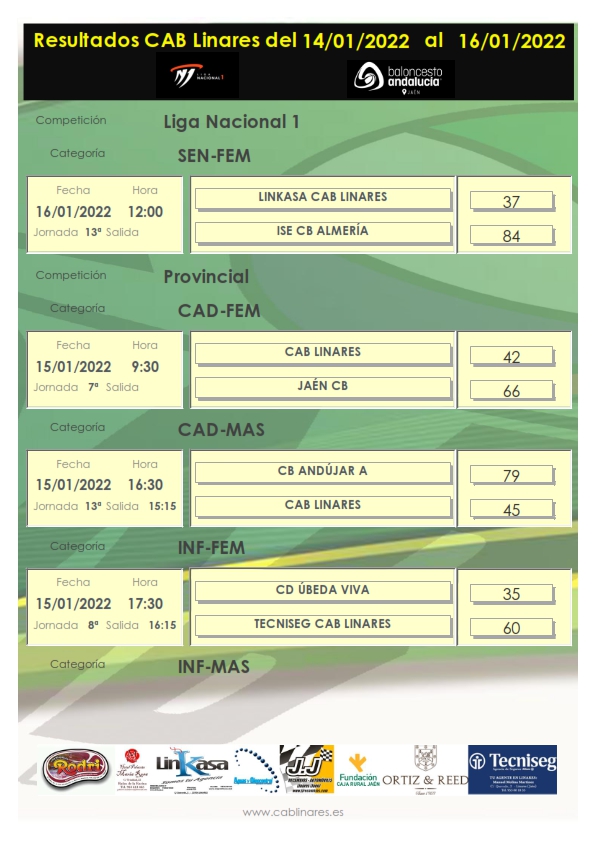 La tarde del sábado nos dejaba la derrota del cadete masculino en tierras iliturgitanas y las cómodas victoria del infantil femenino, Tecniseg CAB Linares y del infantil masculino, Carnicería Rodri CAB Linares en Úbeda. El encuentro que debía disputar nuestro senior masculino Valencianos CAB Linares ante Cazorla Basket tuvo que ser aplazado.