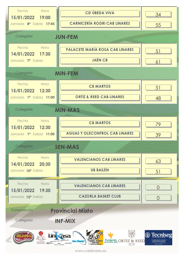 Comenzaba la jornada el viernes por la tarde con el partido junior femenino que enfrentaba a nuestro equipo, Palacete María Rosa CAB Linares, con Jaén CB. El encuentro se mantuvo con diferencias estables cercanas a los diez puntos de las jiennenses, que con su victoria se afianzan en el liderato de la competición, dejando a las nuestras en una segunda posición, perseguidas de cerca por UB Bailén y CB Andújar, que disputarán sus encuentros dentro de quince días. El infantil mixto veía aplazado el encuentro que tenía que disputar ante ADB Villanueva de la Reina. El senior masculino Valencianos CAB Linares recuperaba con victoria el partido aplazado con UB Bailén, aferrándose así a los primeros puestos del grupo de la competición provincial.