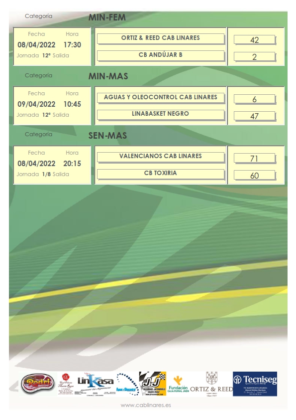 En la tarde del viernes el mini femenino, Ortiz & Reed CAB Linares se imponía en el Huarte al equipo B de CB Andújar. El senior femenino de Copa Diputación perdía su encuentro en el Julián ante Jaén CB en un partido en el que siempre fue a remolque en el marcador. El junior masculino JJ Recambios CAB Linares debutaba en Copa Diputación con derrota en Bailén. El senior masculino, Valencianos CAB Linares, conseguía una trabajada victoria en el partido de vuelta de la eliminatoria de octavos de final de la Liga Provincial ante CB Toxiria, al que y había vencido, también de forma ajustada, en el partido de ida la semana anterior.