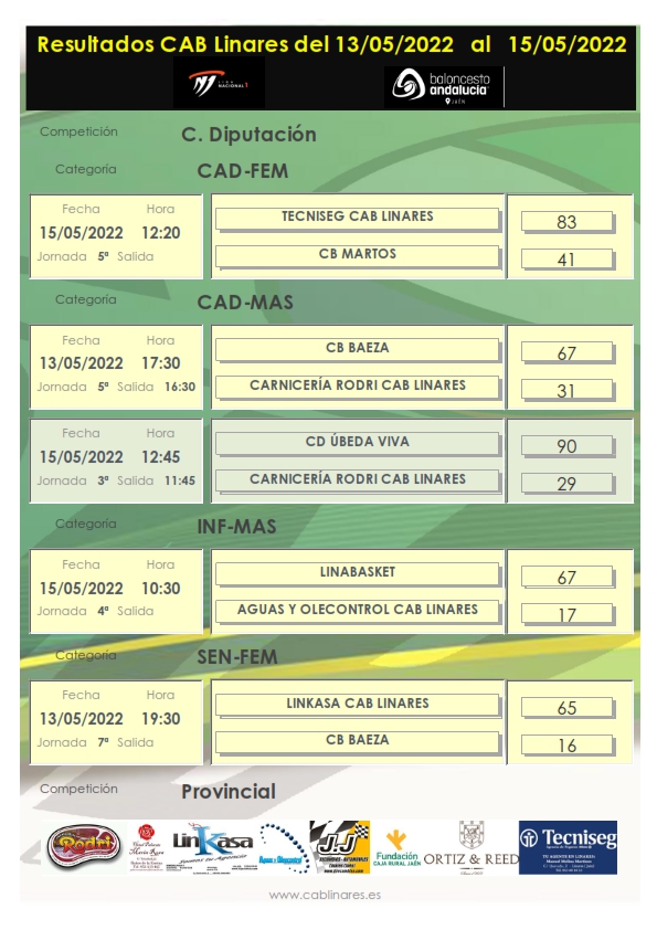 En la mañana del domingo el infantil masculino de Copa Diputación, Aguas y Oleocontrol CAB Linares, caía derrotado en el derbi local ante Linabasket. El cadete femenino, Tecniseg CAB Linares, derrotaba en el Julián a CB Martos y el cadete masculino sufría su segunda derrota del fin de semana en su visista a Úbeda.