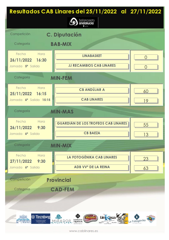 El domingo el mini mixto La Fotogénika CAB Linares perdía en encuentro de Copa Diputación ante ADB Villanueva de la Reina. El cadete femenino vencía a domicilio al equipo B de CB Andújar y el infantil masculino Carnicería Rodri CAB Linares vencía en Linares a CB Martos. Distinta suerte corrían el cadete masculino, Linkasa CAB Linares y el senior femenino, que ambos caían derrotados ante CB Martos.