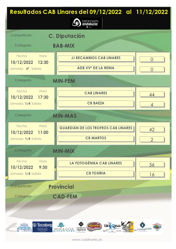El sabado por la mañana victoria para los equipos minis masculinos. La Fotogénika CAB Linares vencía en cuartos de final de Copa Diputación a CB Toxiria. AOVE Guardián de los Trofeos se imponía también en el partido de cuartos copero a CB Martos. El junior femenino El Mirador de María Rosa CAB Linares no tenía problemas para imponerse en la cancha de CB Baeza. Los chicos y chicas del baby mixto JJ Recambios CAB Linares disfrutaban de su partido ante ADB VVª de la Reina.