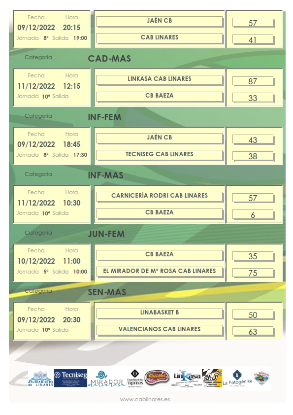 El viernes por la tarde el infantil femenino, Tecniseg CAB Linares, caía derrotado en Jaén en un partido igualado que se resolvió en los últimos minutos a favor de Jaén CB. Igual suerte corrían las compañeras del cadete femenino que se traían una derrota de Jaén en una tarde muy lluviosa. En el Juliá Jiménez el senior masculino Valencianos CAB Linares cosechaba una nueva victoria, en esta ocasión ante el conjunto junior de Linabasket.