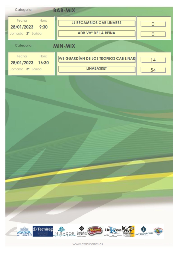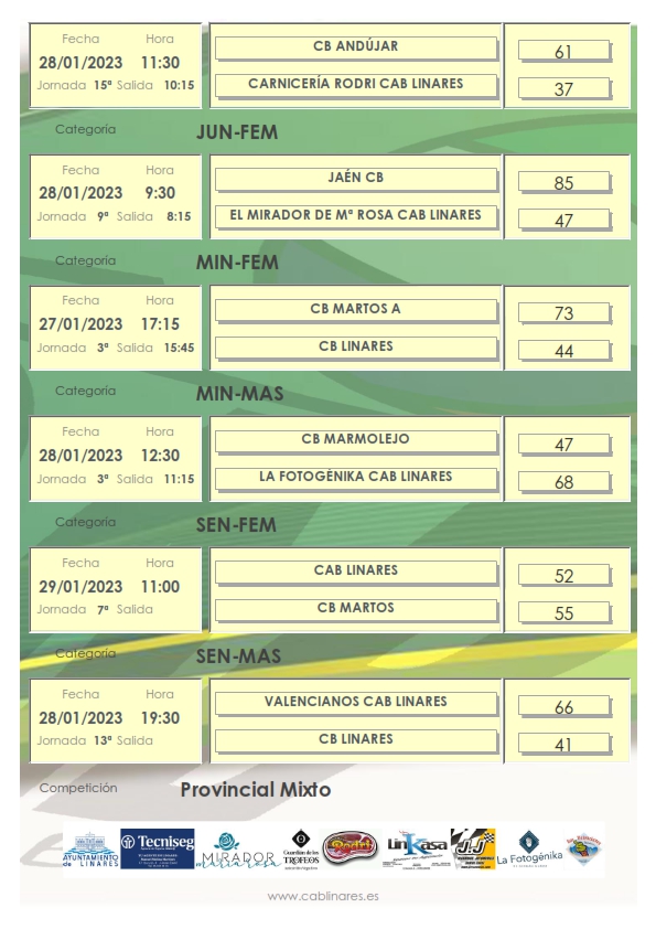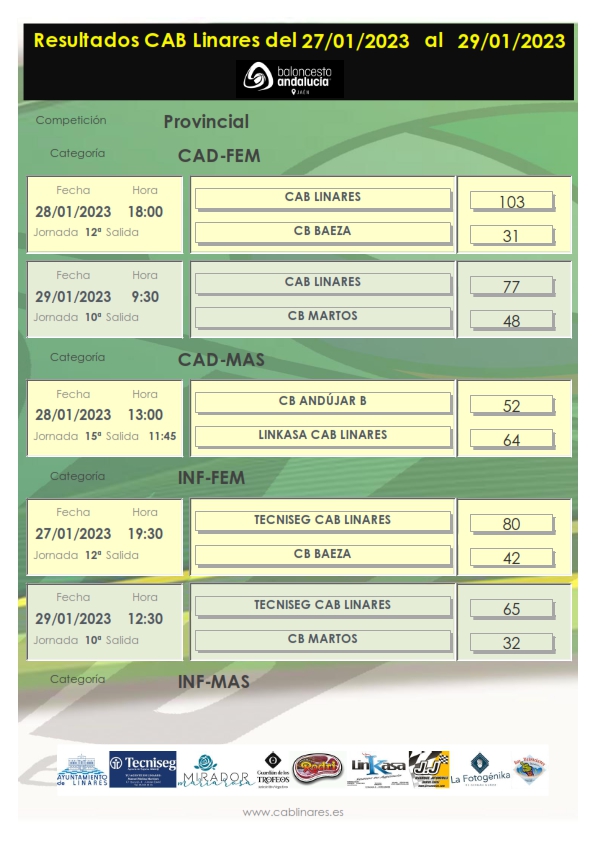 El sábado por la mañana el baby mixto JJ Recambios CAB Linares disputaba su partido de la Liga Valorcesto ante ADB Villanueva de la Reina. El junior femenino El Mirador de María Rosa CAB Linares caía ampliamente derrotado en su visita a Jaén CB. El infantil masculino Carnicería Rodri CAB Linares se traía una derrota de Andújar en partido disputado en la mañana del sábado, quedándose en la clasificación en el límite de los puestos que dan acceso a la Fase Final Provincial a estas alturas de la temporada. El mini masculino La Fotogénika CAB Linares se hacía con la victoria en una cancha siempre complicada como es la de Marmolejo. El cadete masculino Linkasa CAB Linares vencía en su desplazamiento a Andújar en el que se enfrentaba al equipo B iliturgitano.