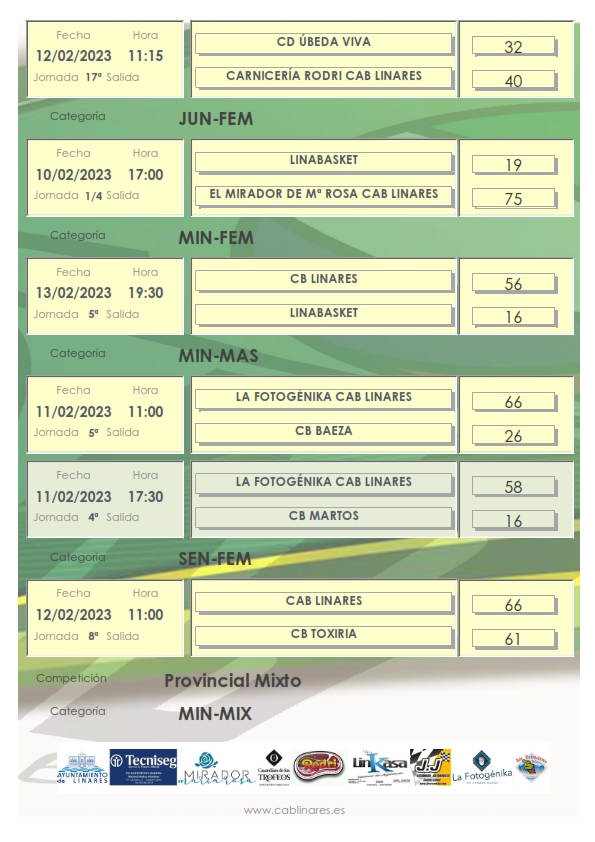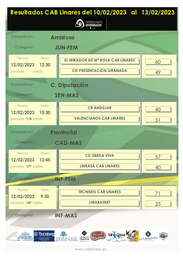 En la mañana del domingo el infantil femenino Tecniseg CAB Linares se imponía en el derbi local a Linabasket. A continuación el senior femenino lograba su tercera victoria de la temporada ante CB Toxiria. El infantil masculino Carnicería Rodri CAB Linares saldaba con victoria su visita a CD Úbeda Viva. Peor suerte corrían sus compañeros cadetes de Linkasa CAB Linares, que caián en la pista ubetense. El senior masculino Valencianos CAB Linares derrotaba a domicilio a CB Andújar en jornada de cuartos de final de la Copa Diputación y cerraba la jornada de domingo un encuentro de caracter amistoso entre nuestro equipo junior femenino El Mirador de María Rosa CAB Linares y el cadete de CD Presentación, que acababa con victoria de las chicas de Manute y Nuria. Agradecemos al conjunto granadino su predisposición para jugar este amistoso y su visita.