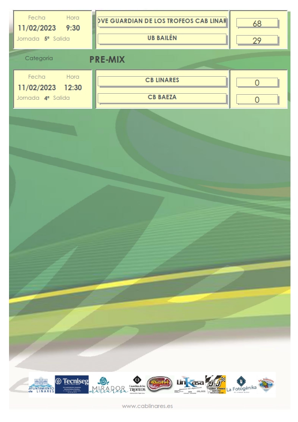 En la mañana del sábado el el mini mixto AOVE Guardián de los Trofeos CAB Linares vencía a UB Bailén en encuentro disputado en el Huarte. A continuación disputaba su partido el mini masculino La Fotogénika CAB Linares que se imponía a CB Baeza. Cerraba la jornada matinal en el Huarte el premini mixto CB Linares que disputaba su partido de Liga Valorcesto snte CB Baeza.