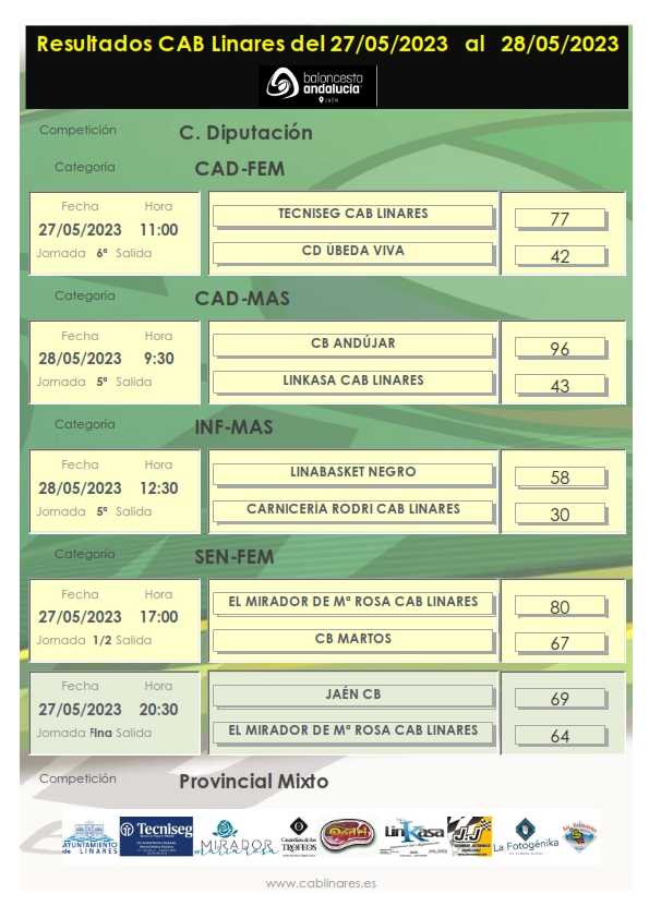 El cadete femenino Tecniseg CAB Linares vencía en la última jornada de Copa Diputación a CD Úbeda Viva y se clasifica para la fase final que tendrá lugar el fin de semana próximo. El mini mixto AOVE Guardián de los Trofeos CAB Linares vencía a CB Sabiote en la penúltima jornada del campeonato provincial.