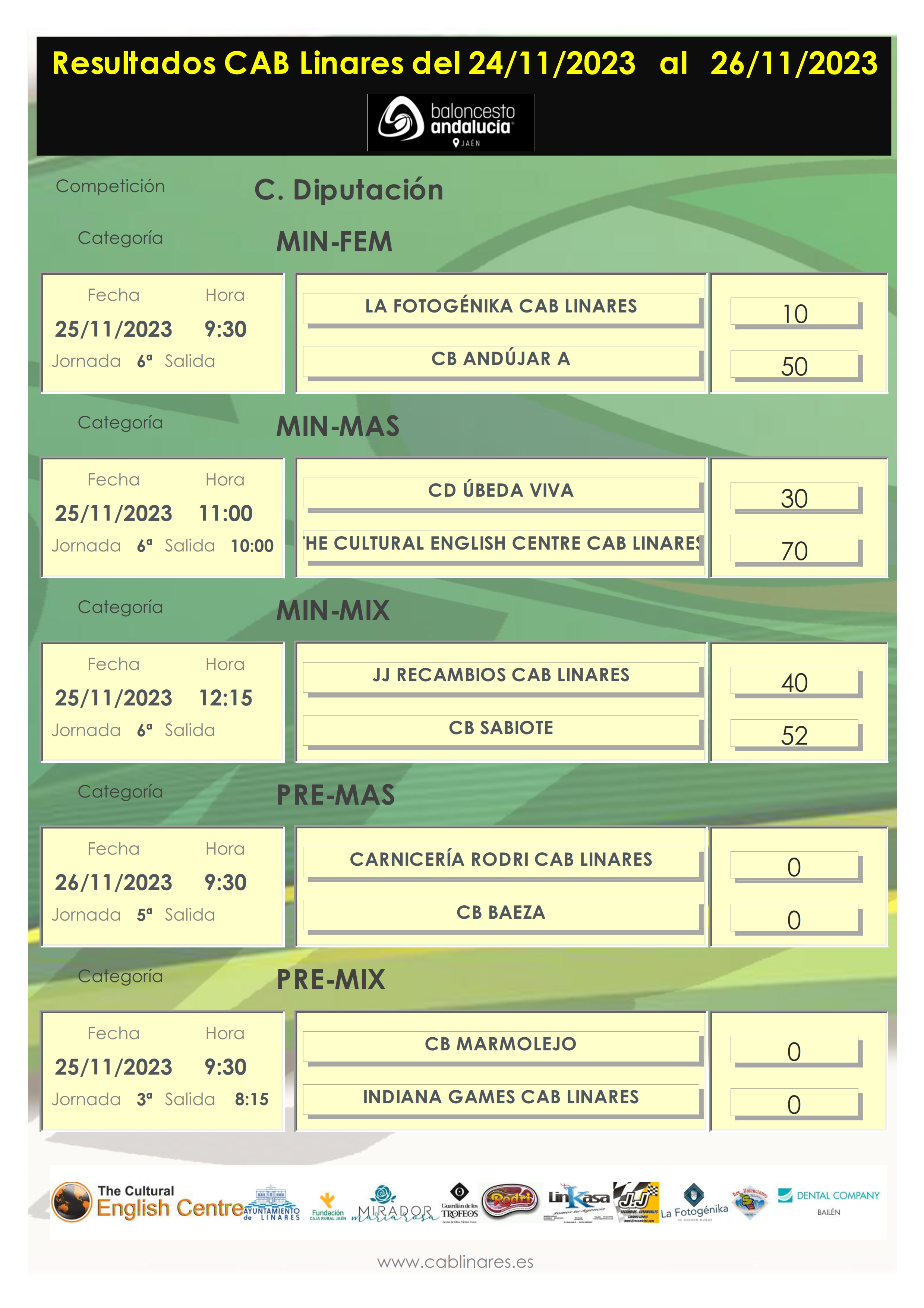En la mañana del domingo el premini masculino Carnicería Rodri CAB Linares disputaba su encuentro de Copa Diputación con CB Baeza y el cadete femenino Dental Company CAB Linares no tenía problemas para imponerse al conjunto B de CB Andújar. El cadete masculino Linkasa CAB Linares caía derrotado en su encuentro con Linabasket y cerraba la jornada el infantil masculino AOVE Guardián de los Trofeos CAB Linares se traía una derrota de su visita a CD Úbeda Viva.