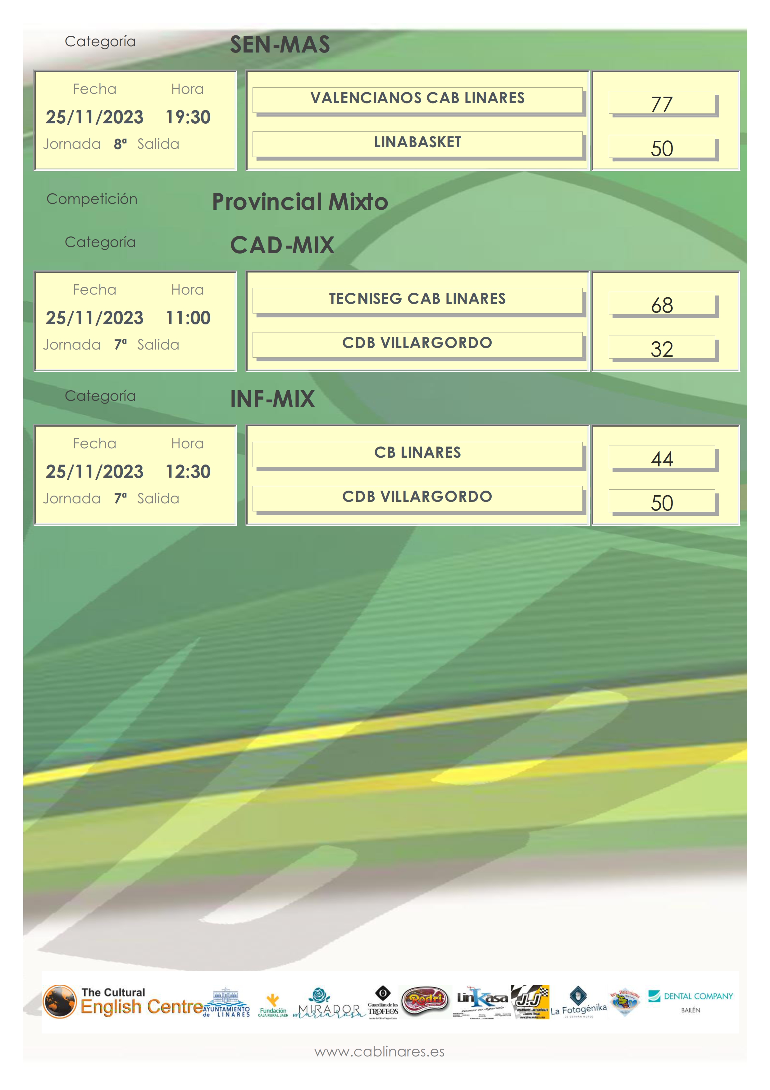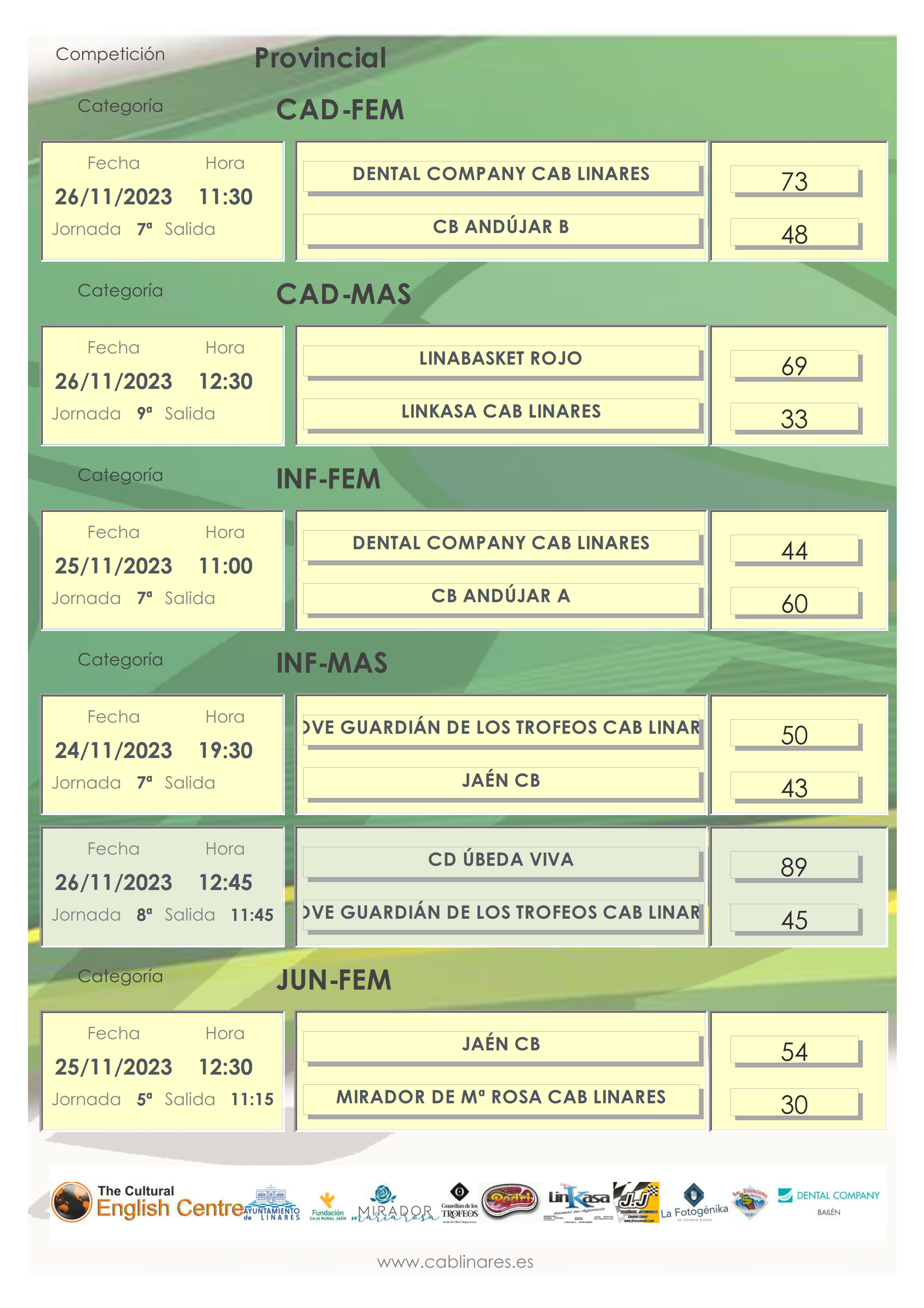 En la mañana del sábado el premini mixto Indiana Games CAB Linares viajaba a Marmolejo para disputar su partido de Copa Diputación. El mini femenino La Fotogénika CAB Linares caía derrotado en el Huarte ante CB Andújar. El infantil femenino Dental Company CAB Linares tras un mal primer cuaro que marcó el desarrollo del encuentro, caía derrotado ante CB Andújar. El cadete mixto Tecniseg CAB Linares lograba la victoria ante CDB Villargordo. El mini masculino The Cultural English Centre CAB Linares no tenía problemas para vencer en su visita a Úbeda. El mini mixto JJ Recambios CAB Linares no podía en su encuentro de Copa Diputación con el conjunto de Sabiote. El junior femenino Mirador de María Rosa CAB Linares caía derrotado en su visita a Jaén CB y cerraba la mañana de sábado el infantil mixto que caía por una corta diferencia ante CDB Sabiote.