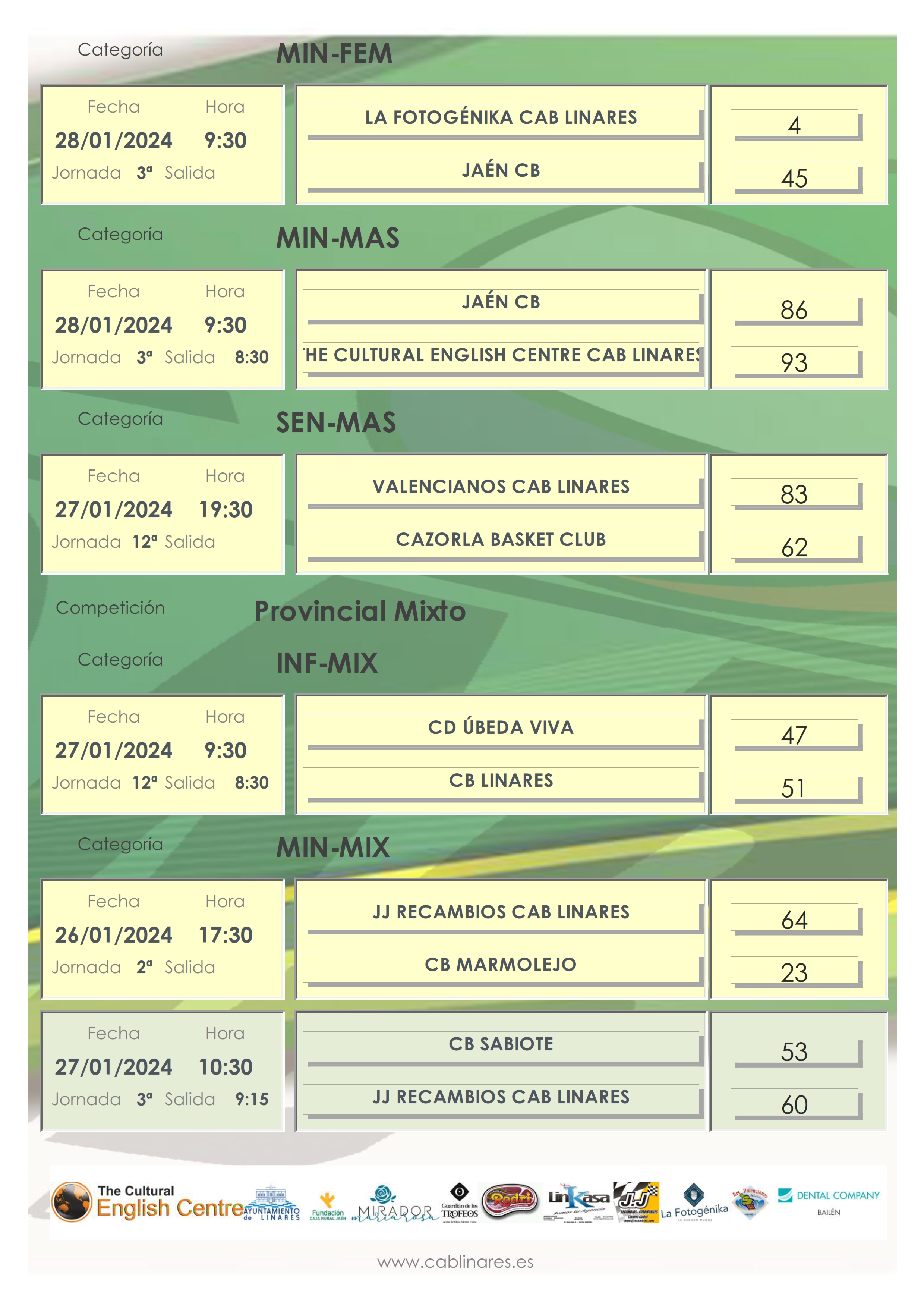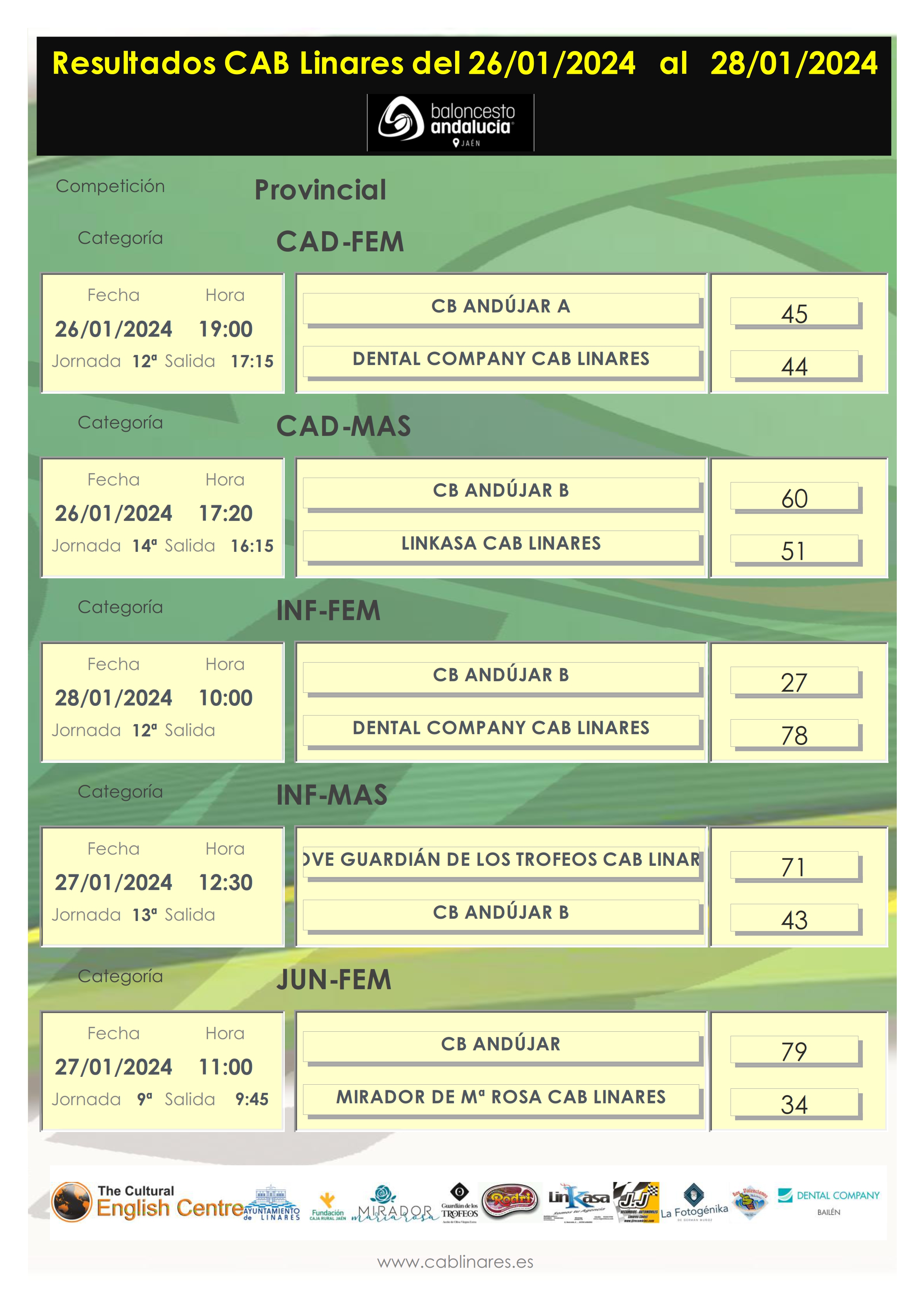 Abría la jornada matinal de domingo el mini femenino La Fotogénika CAB Linares que caía derrotado en el Huarte ante Jaén CB. El mini masculino The Cultural English Centre CAB Linares lograba una meritoria victoria en su visita a Jaén CB. El infantil femenino Dental Company CAB Linares no tenía problemas para vencer a domicilio al equipo B de CB Andújar.