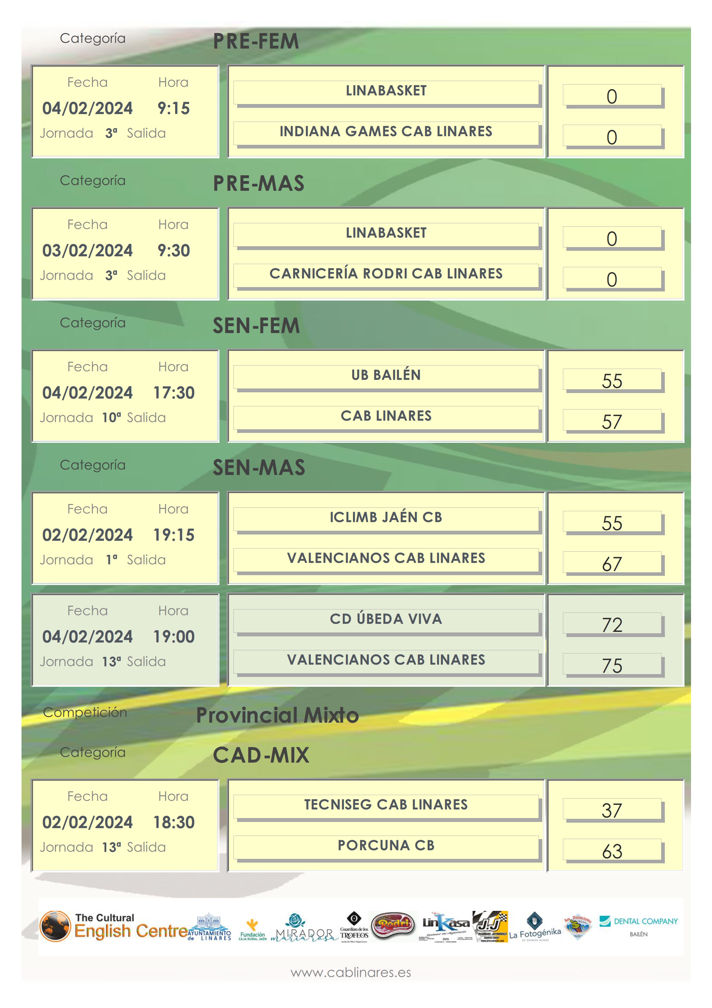 Comenzaba la jornada en la tarde del viernes con la disputa de tres encuentros de categoría mixta de nuestro mini, infantil y cadete, los tres ante Porcuna CB. Victoria del mini mixto JJ Recambios CAB Linares y del infantil mixto y derrota del cadete Tecniseg CAB Linares. El senior masculino Valencianos CAB Linares se imponía en Jaén en el partido de la eliminatoria de octavos de final de Copa Diputación.