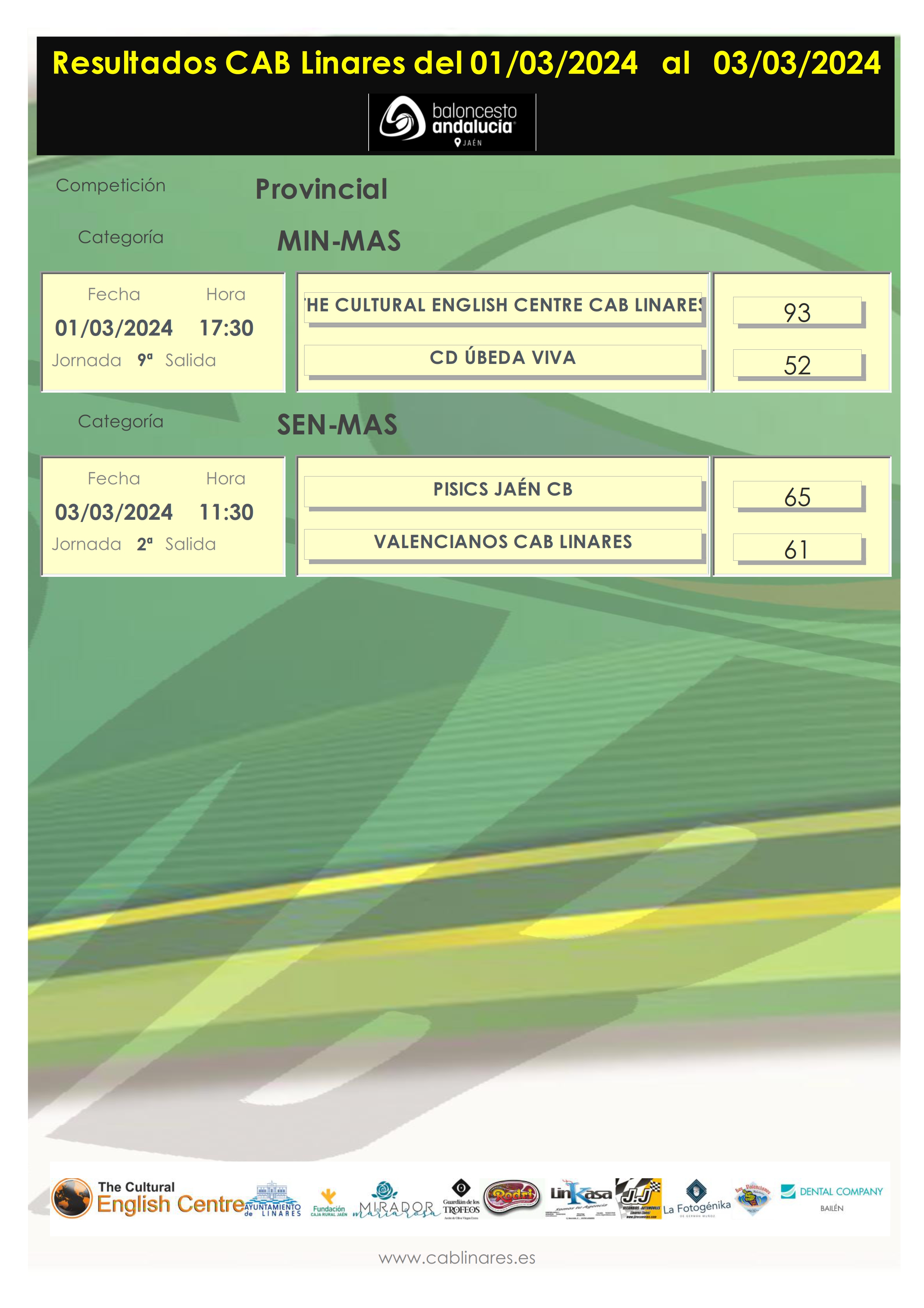 Una victoria y una derrota nos deja esta jornada parca en encuentros para los equipos de CAB Linares. El mini masculino, The Cultural English Centre CAB Linares vencía en la tarde del viernes a CD Úbeda Viva manteniendo así el liderato de la competición. El senior masculino, Valencianos CAB Linares, sufría en Jaén su segunda derrota de la temporada ante Piscis Jaén CB, con el cual comparte ahora el liderato de la segunda fase de la competición liguera.