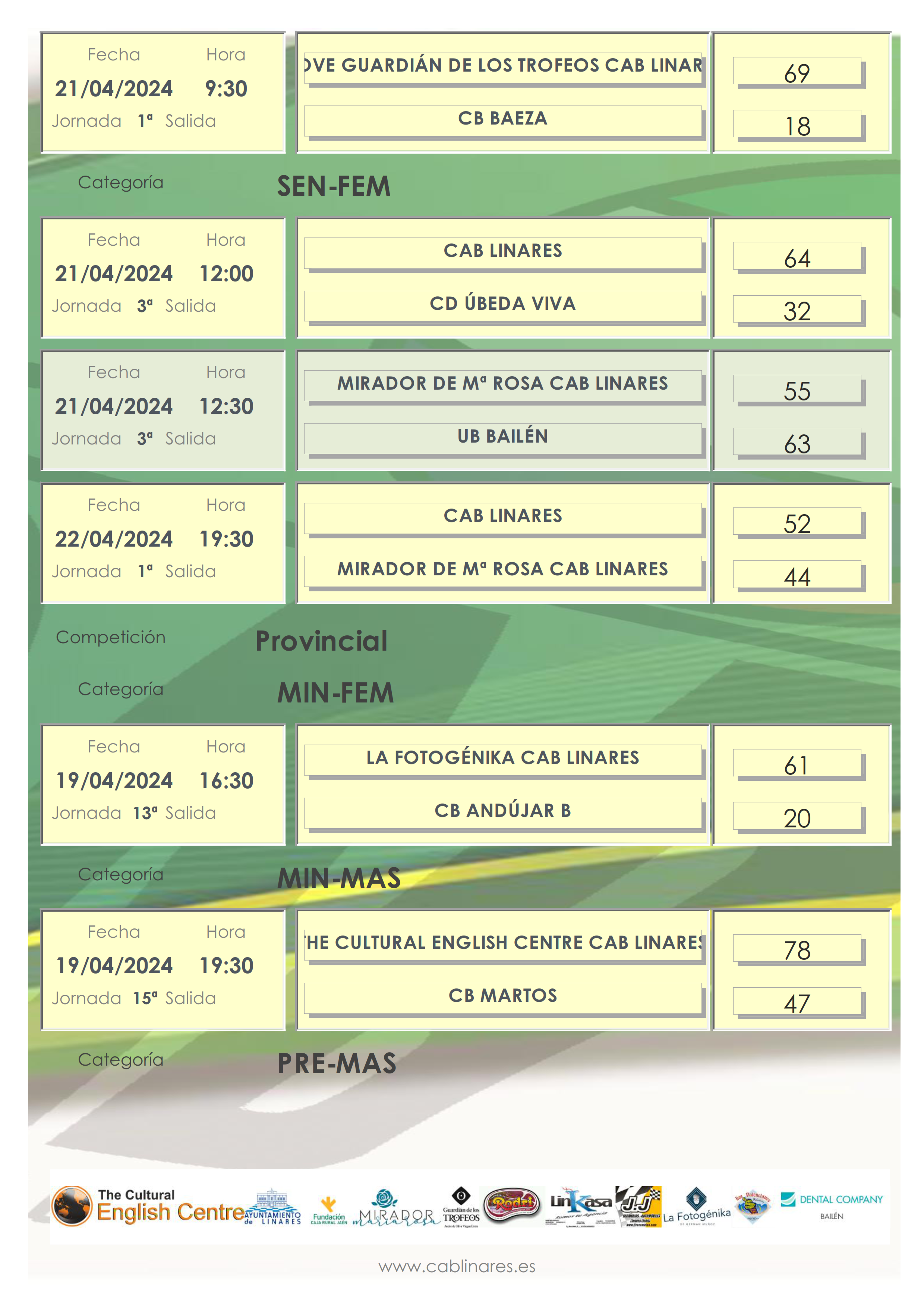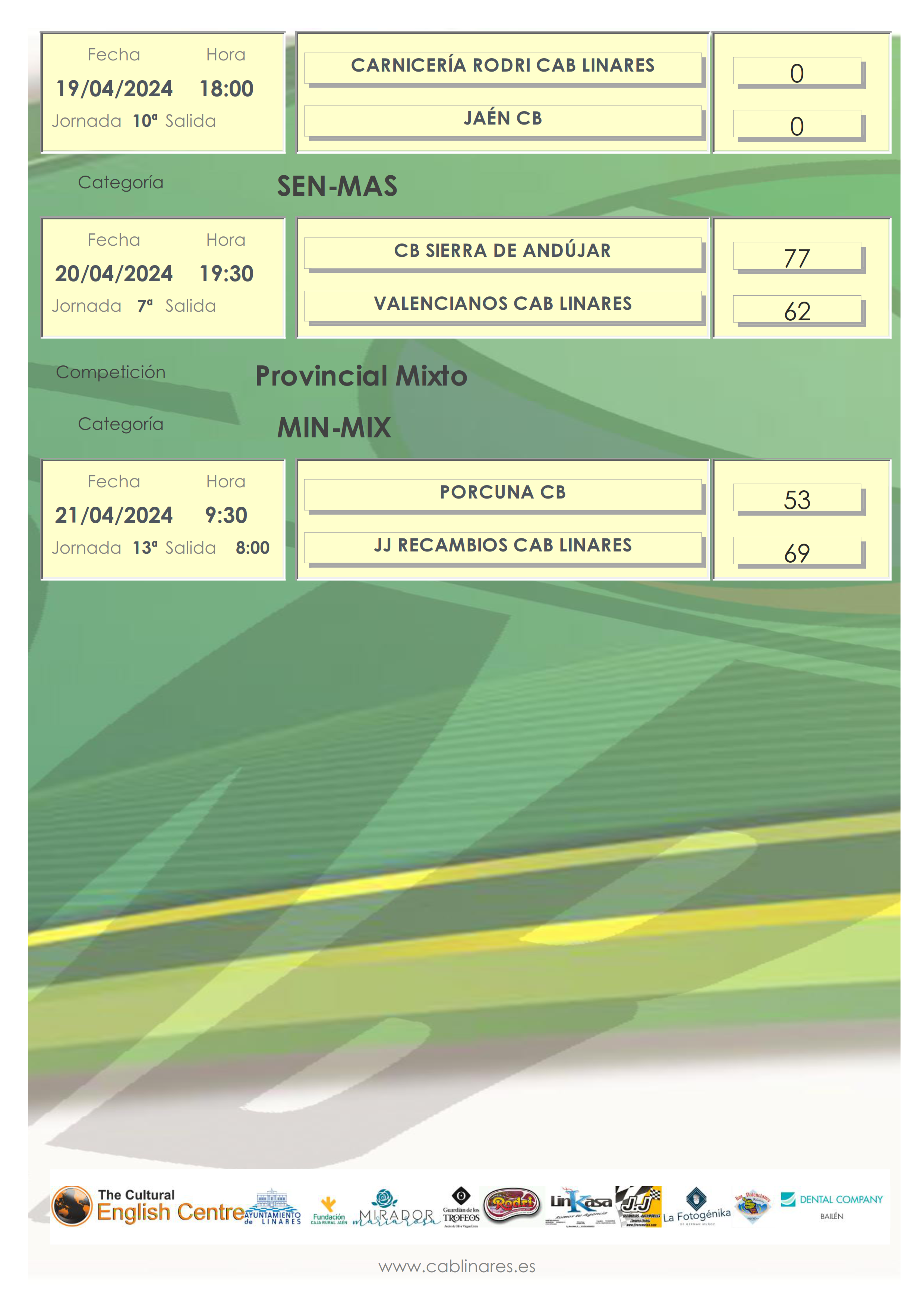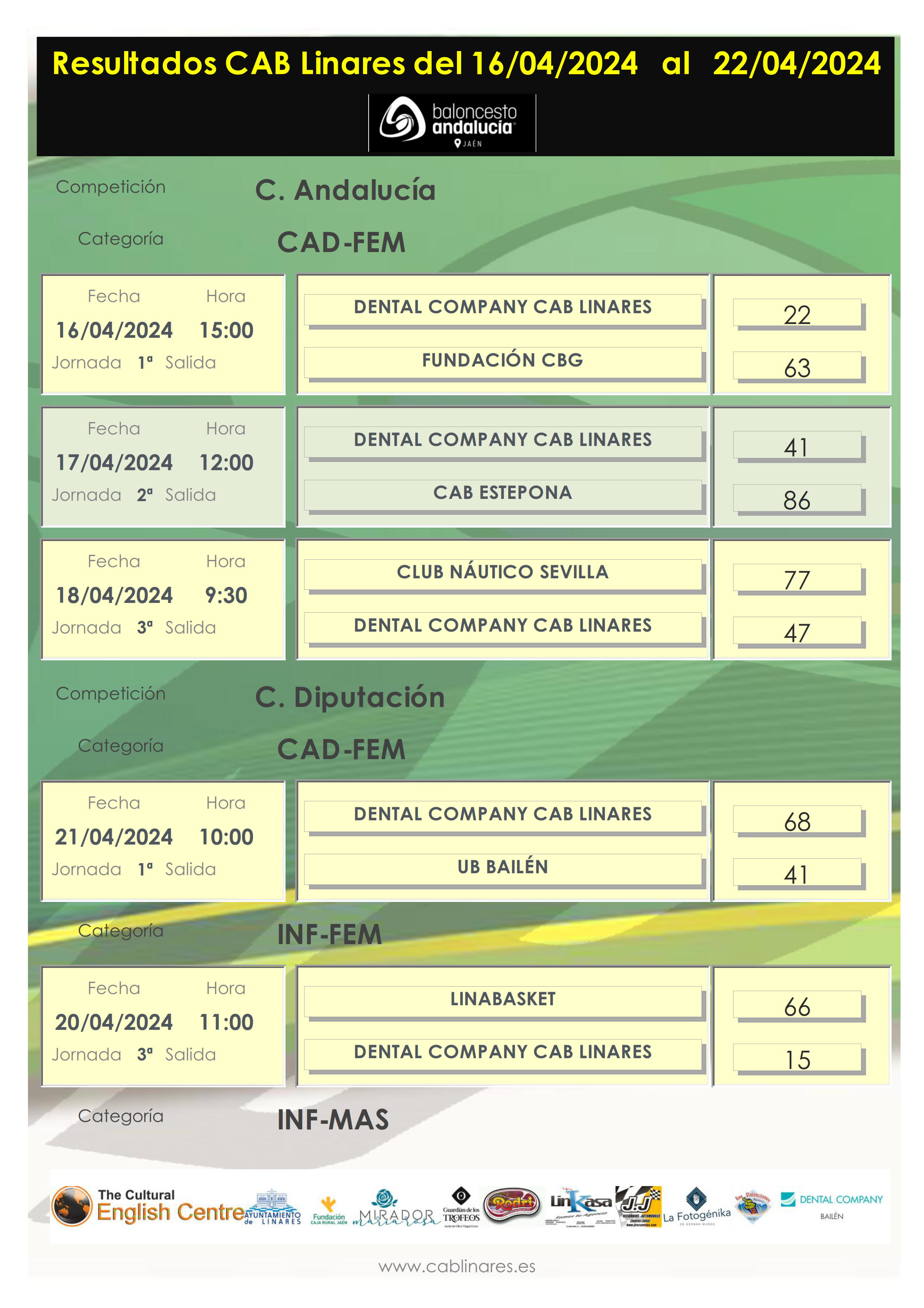 En la mañana del sábado el infantil femenino de Copa Diputación, Dental Company CAB Linares, caía derrotado ante Linabasket. En partido vespertino, un mermado senior masculino Valencianos CAB Linares, caía derrotado ante CB Sierra de Andújar en tierras iliturgitanas, lo que complica sus aspiraciones para ser primeros de esta segunda fase de la competición liguera.