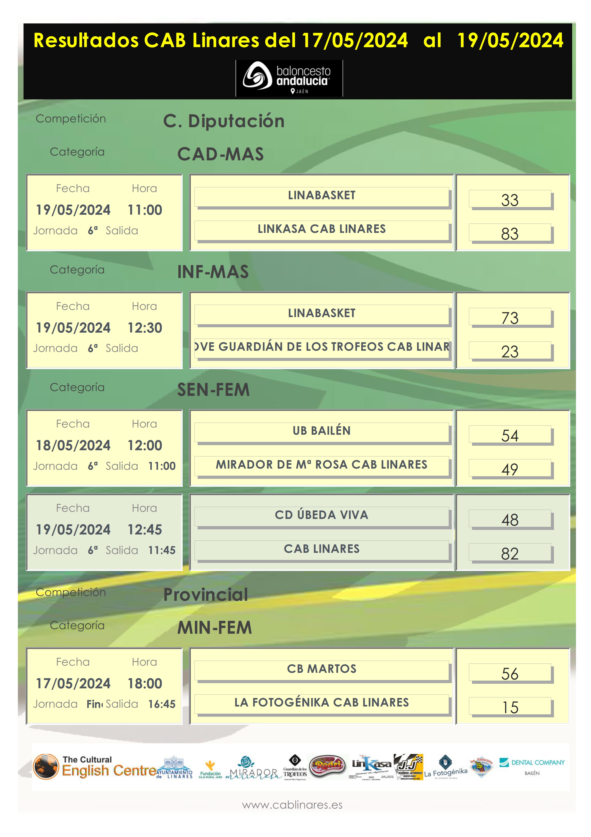 El domingo el cadete masculino Linkasa CAB Linares vencía en el Huarte a Linkabasket cómodamente haciéndose así con el primer puesto en el grupo de Copa Diputación, lo que le da una ligera ventaja para el cruce correspondiente con los otros grupos de la competición. El infantil masculino AOVE Guardián de los Trofeos CAB Linares finalizaba su participación en la Copa Diputación con derrota ante Linabasket Fin de temporada para este equipo integrado mayoritariamente por jugadores de primer año que esperamos que haya servido como acumulación de experiencia para el curso próximo. Finalizaba la mañana con la disputa de un intrascendente partido senior femenino, en el que nuestro equipo certificaba su primera plaza en la fase de grupos de Copa Diputación con su victoria en Úbeda, a la espera de la semfinal que las enfrentará a CB Martos la próxima semana.