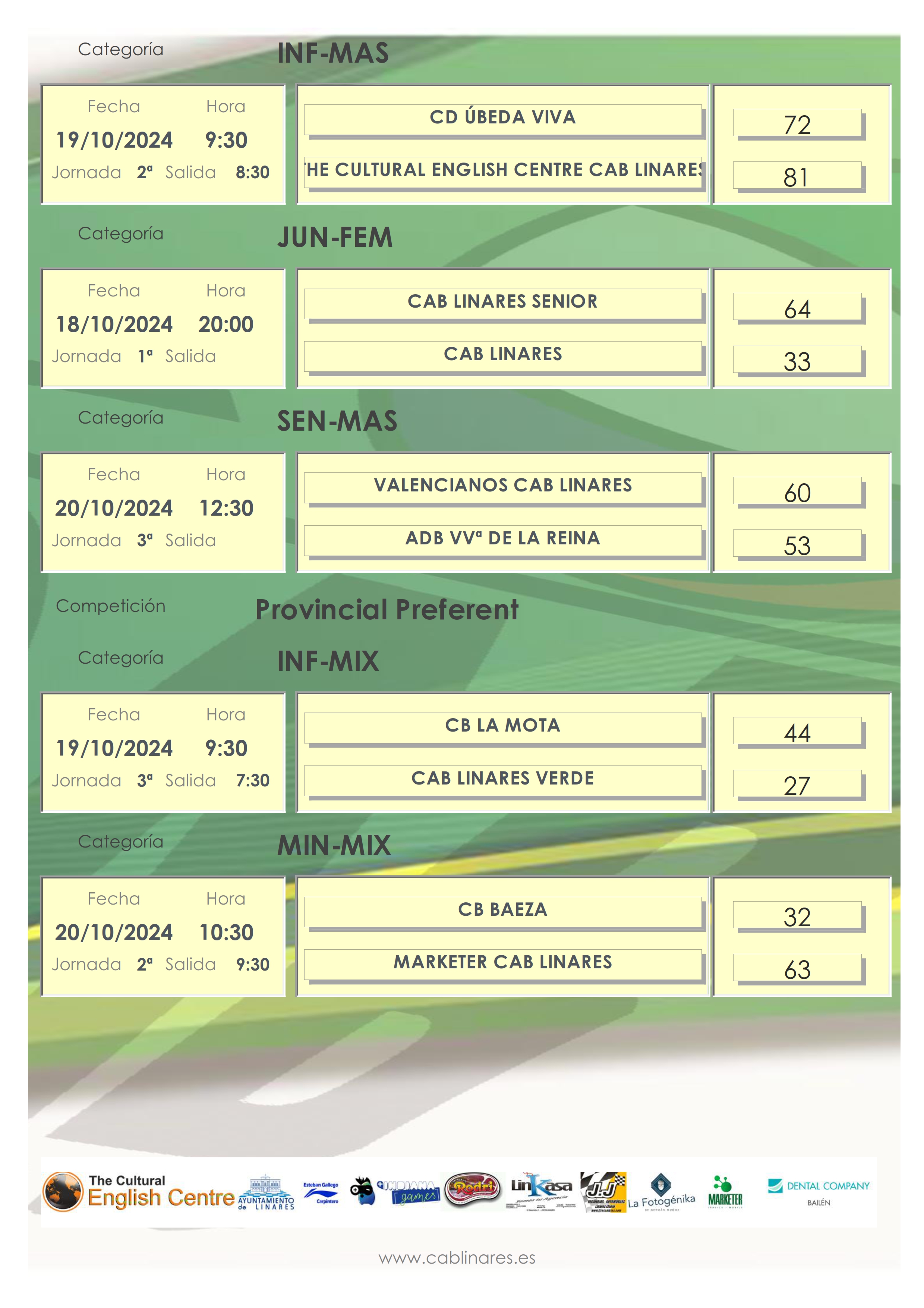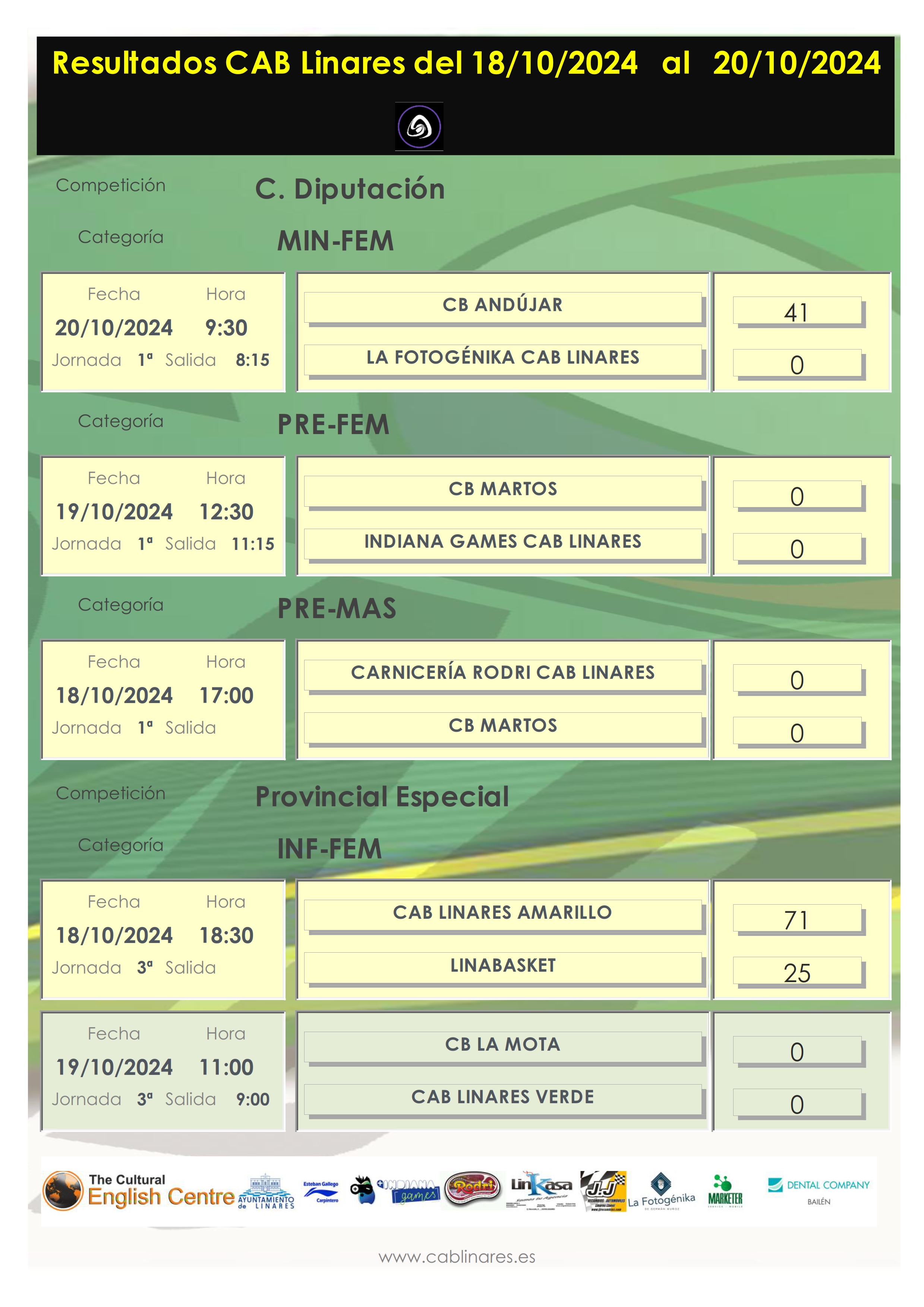 El sábado por la mañana el infantil masculino, The Cultural English Centre CAB Linares, lograba la victoria en su visita a Úbeda. El conjunto mini mixto caía derrotado en su visita a Alcalá La Real ante CB La Mota. A continuación se disputaba el infantil femenino verde su partido de la jornada, en el que no se reflejó resultado debido a que las de Raquel acudieron con tan solo nueve jugadoras a disputar el encuentro. El premini femenino, Indiana Games CAB Linares viajaba a Martos para su debut esta temporada.