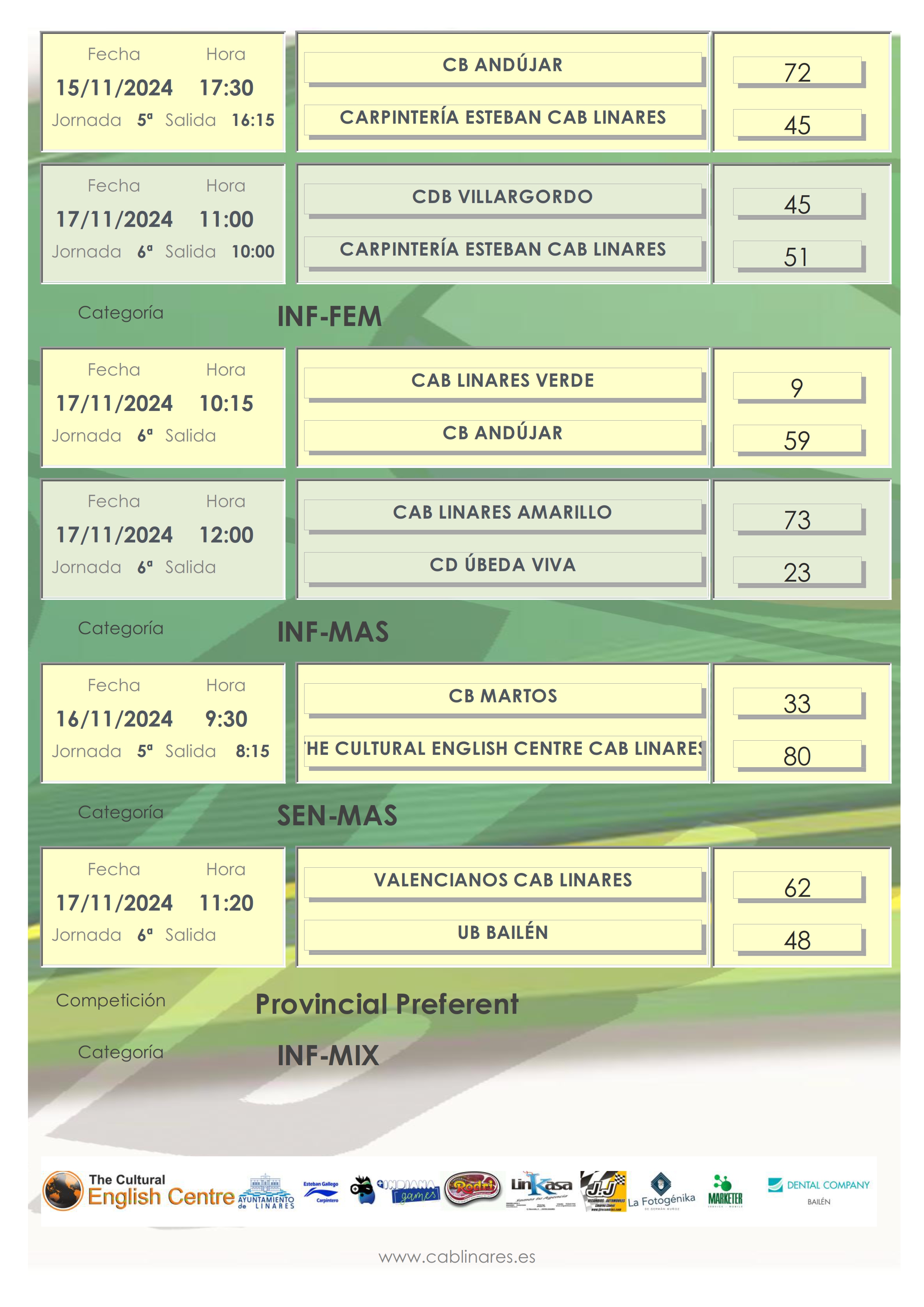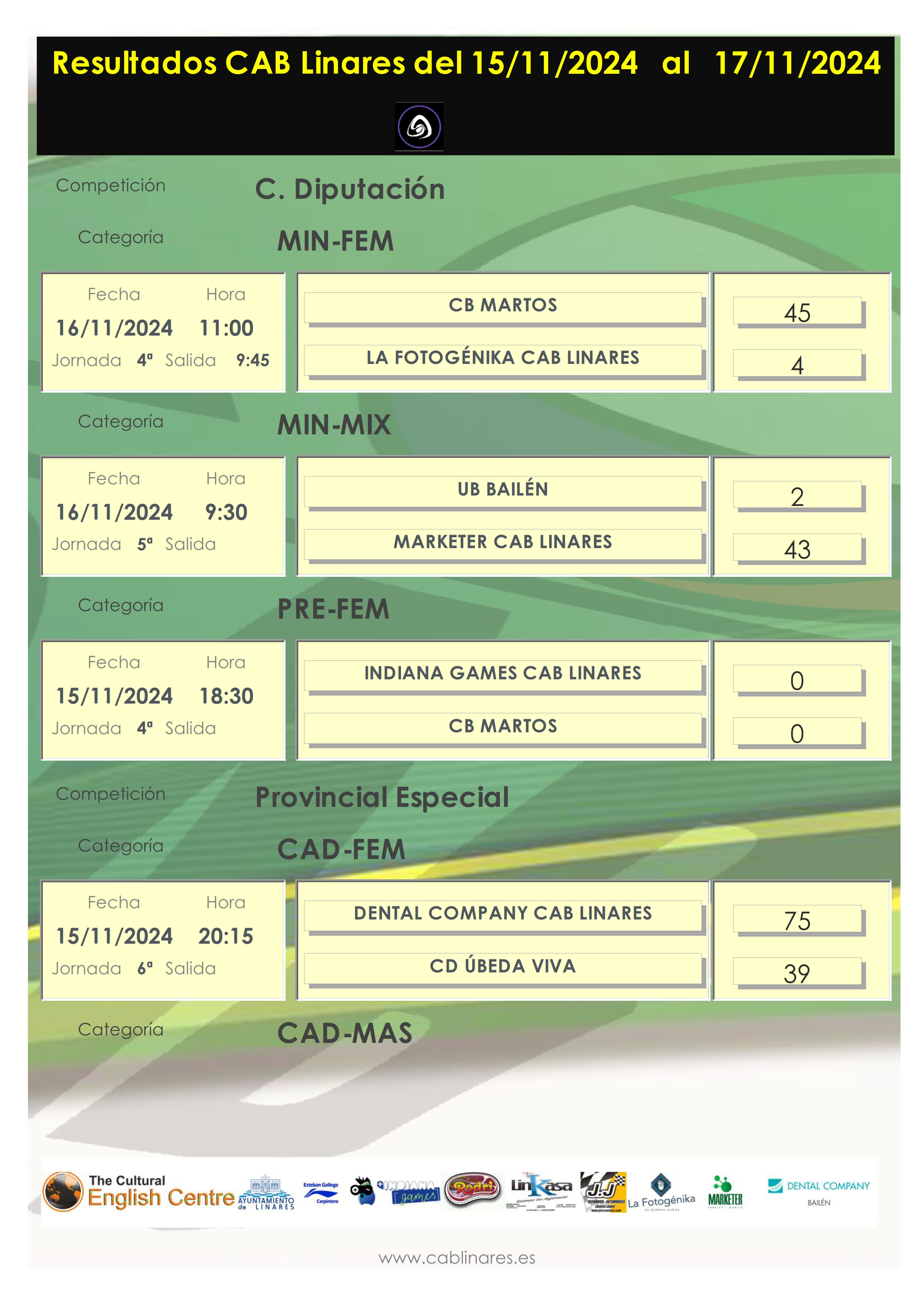 El sábado por la mañana el infantil masculino, The Cultural English CAB Linares, vencía en su visita a CB Martos. El mini femenino, La Fotogénika CAB Linares, disputaba a continuación su encuentro de Copa Diputación en el que caía derrotado ante las chicas de la ciudad de la Peña. El mini mixto, Marketer CAB Linares lograba la victoria en su desplazamiento a Bailén.