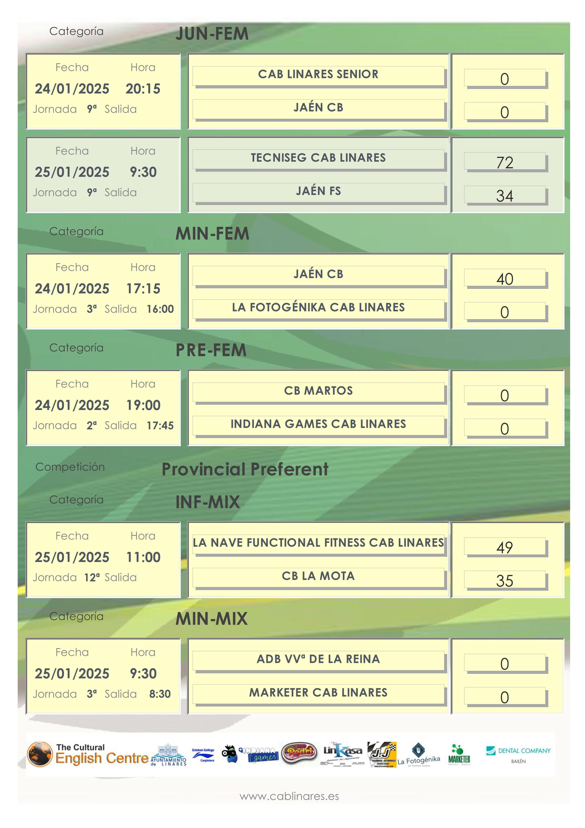 El sábado por la mañana el junior femenino, Tecniseg CAB Linares, se imponía a Jaén FS y a falta de una sola jornada para el fin de liga regular aspira a alcanzar la segunda posición de cara a la fase final que se disputará próximamente en Andújar. El mini mixto, Marketer CAB Linares, disputaba su encuentro en Villanueva de la Reina, partido en el que no se contabilizó anotación al acudir nuestro equipo con menos jugadores de los que establecen las normas en esta competicion. El infantil mixto, La Nave Functional Fitness, vencía en su encuentro ante CB La Mota. Finalizaba la mañana en el Huarte con la primera victoria del infantil femenino amarillo ante CB La Mota.