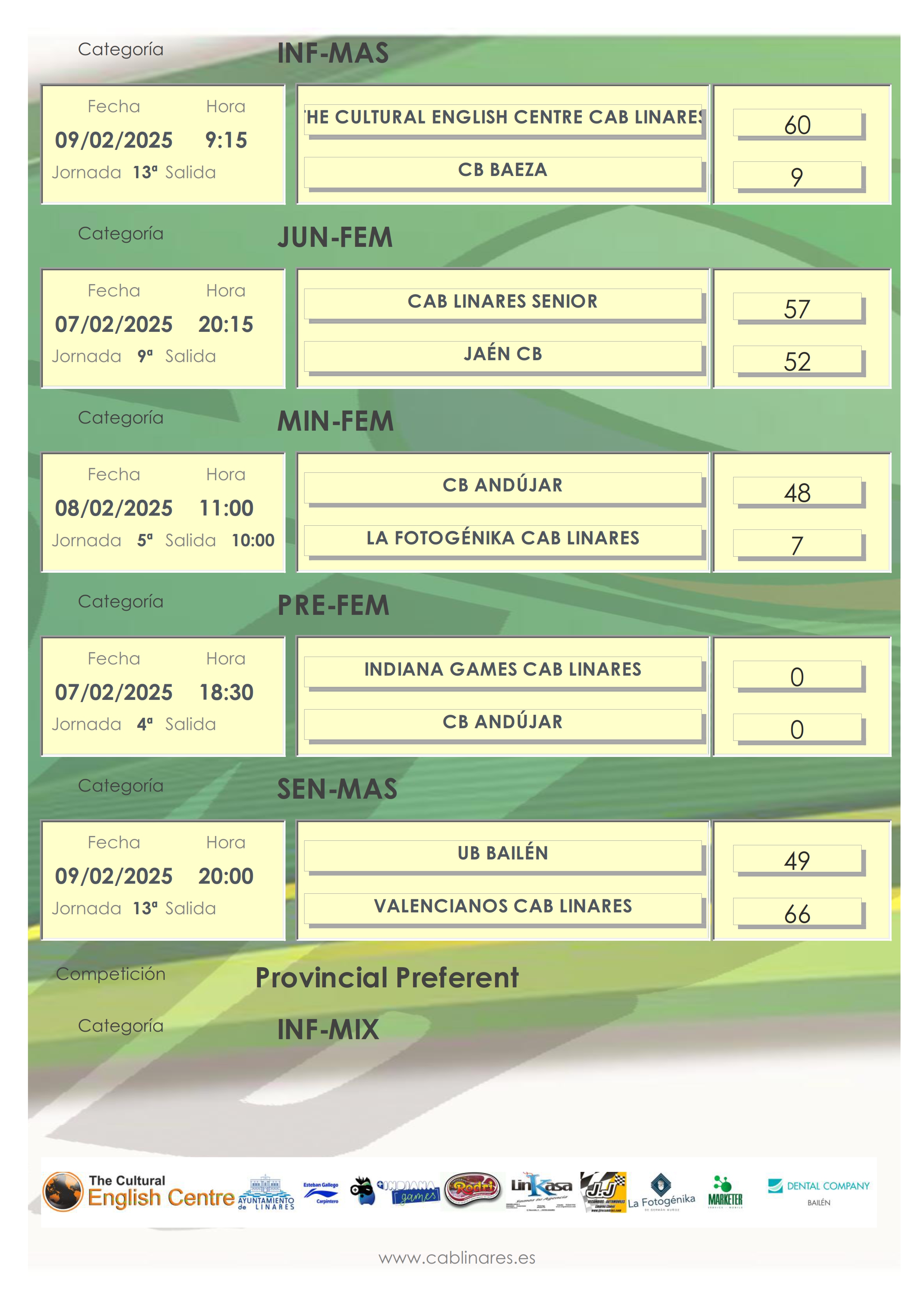 El sábado por la mañana el infantil femenino verde caía derrotado ante Jaén CB. A continuación, las compañeras del amarillo también sufrían una derrota, esta vez ante CB Andújar. Cerraba la mañana en el Huarte el premini masculino, Carnicería Rodrí CAB Linares en su partido de Liga Valorcesto ante CB Andújar. El mini mixto, Marketer CAB Linares se traía una victoria de su visista a Jaén FS.