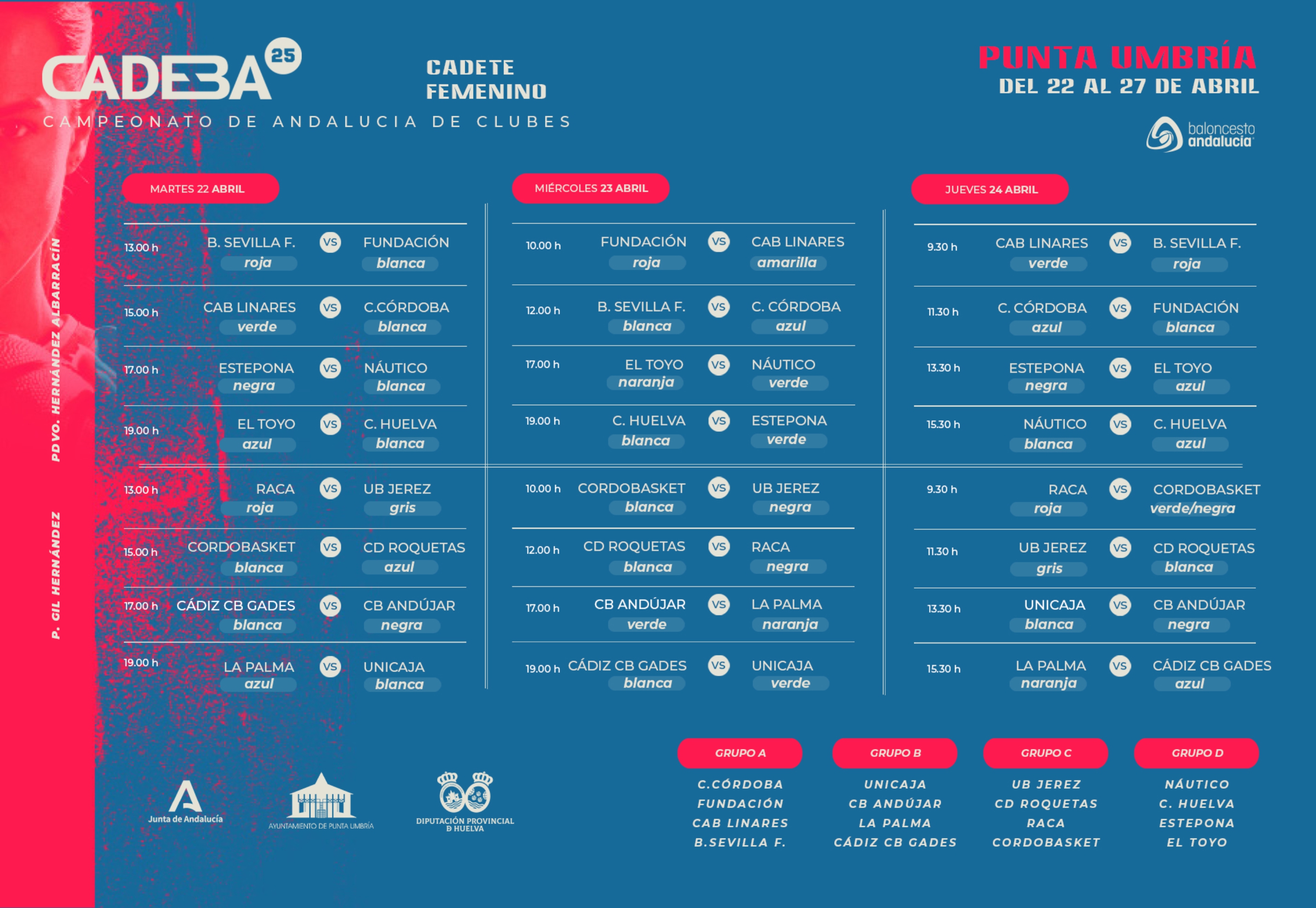 En la jornada del martes se medirán con el conjunto cordobés, el miércoles con el equipo nazarí y cerrarán la fase de grupos el jueves con Baloncesto Sevilla. Todos los partidos se disputarán en horario de mañana en el Polideportivo Hernández Albarracín. La fase eliminatoria la disputarán a partir del jueves los dos primeros clasificados de cada grupo. Los partidos podrán verse a través de la OTT de la FAB y a través de la página de inicio de nuestra web.