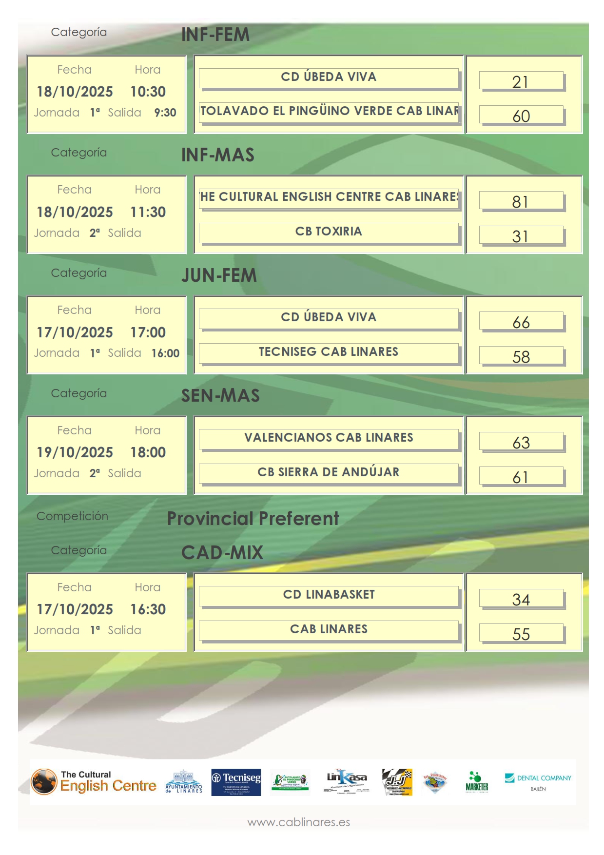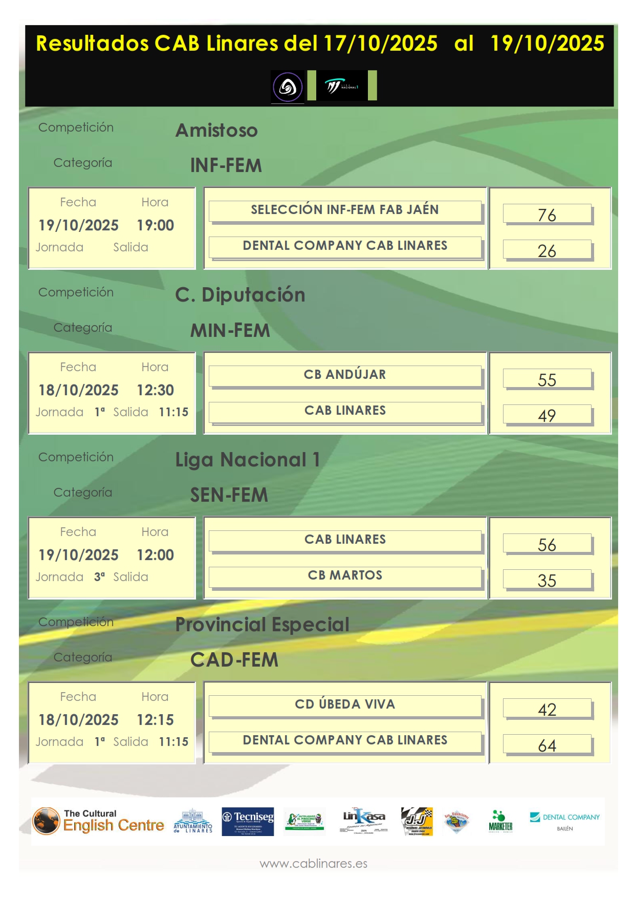 En la mañana del sábado, el infantil femenino, Autolavado El Pingüino Verde CAB Linares, se imponía sin problemas en su debut liguero ante CD Úbeda Viva. A continuación, el cadete femenino, Dental Company CAB Linares, vencía también al conjunto ubetense, aunque le costó mucho a las jugadoras de Miguel A. García encontrar el ritmo de partido que les convenía para imponerse a las locales. El mini femenino, en un partido muy igualado caía derrotado en su visita a CB Andújar en el que era el debut del equipo en Copa Diputación. El infantil masculino, The Cultural English Centre CAB Linares vencía en su enfrentamiento con CB Toxiria en un debut cómodo para los chicos de Lucía.