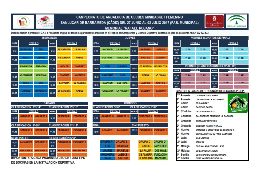 Encuadradas en el grupo A el miércoles disputan una doble jornada. A las 11:15 h juegan con el subcampeón granadino Ramón y Cajal y a las 20:15 h harán lo propio con el subcampeón almeriense La Mojonera. El jueves el rival será el campeón malagueño EBG Málaga a partir de las 13:00 h. En función de la posición obtenida en esta fase de grupos, a partir del viernes lucharán por las plazas de privilegio del campeonato o por los puestos del noveno al decimosexto.