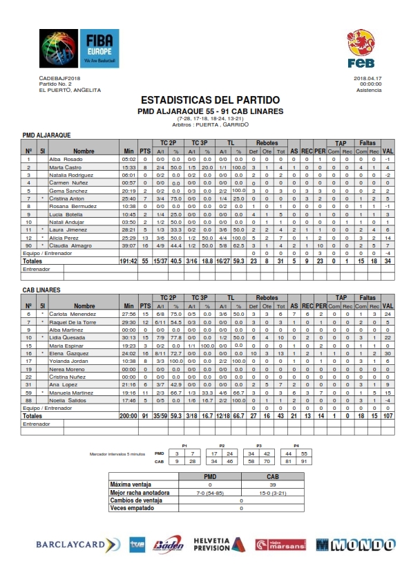 En el tercer periodo hubo altibajos y la ventaja seguía creciendo y el último se desarrolló con la misma tónica, acusando ambos equipos el calor que hacía y los nervios propios del primer día de competición. Se llegó al final del encuentro con victoria por 91-55. Destacar que todas las jugadoras de nuestro equipo anotaron en este partido.