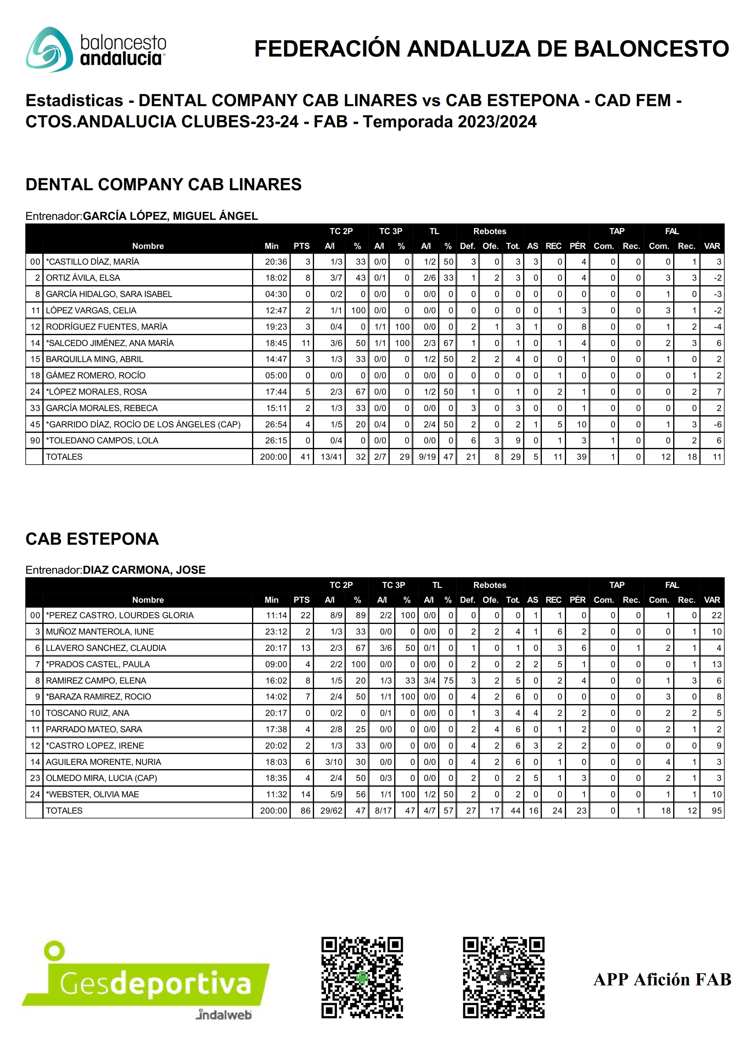 Después del descanso, ya con el partido prácticamente finiquitado las linarenses tiraron de pundonor y con una defensa individual más agresiva supieron parar por momentos el ataque de Estepona, lo que sumado a mejores porcentajes en el tiro consiguieron que la diferencia de puntos no aumentara por lo que se llegó a un marcador final de 41-86.