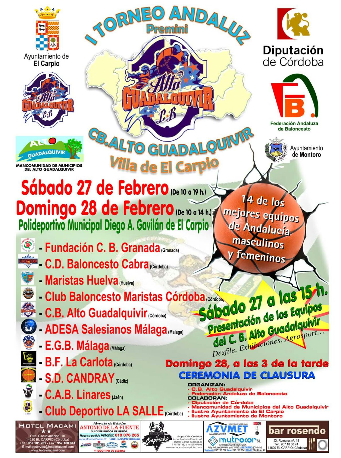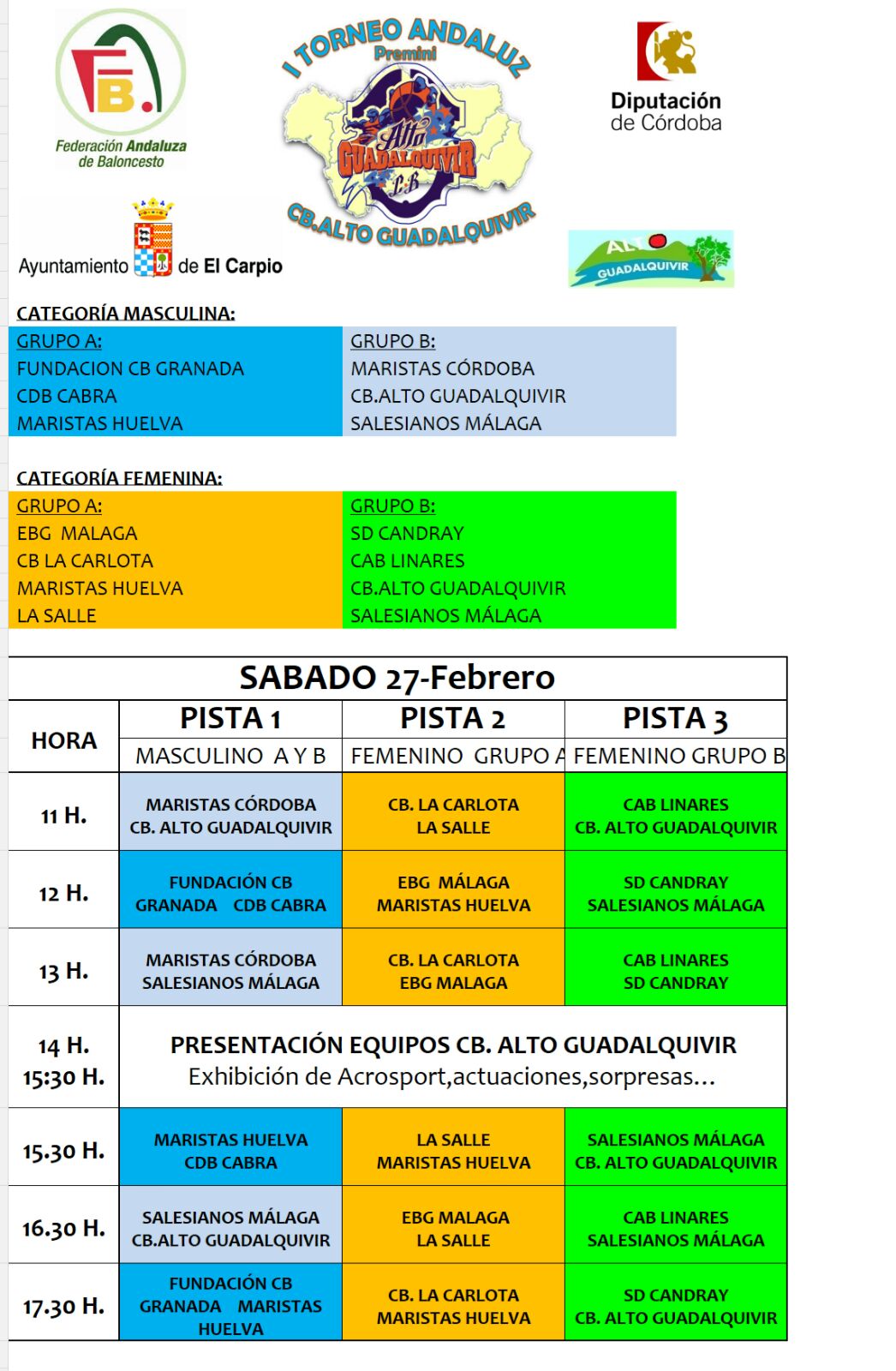 El club Alto Guadalquivir de la localidad cordobesa de El Carpio nos ha invitado a disputar un torneo de categoría premini a disputar el próximo fin de semana, 27 y 28 de febrero en la categoría femenina. Nuestro equipo se enfrentará en dicho torneo a los equipos de SD Candray de Cádiz, Salesianos Málaga y al anfitrión CB Alto Guadalquivir.