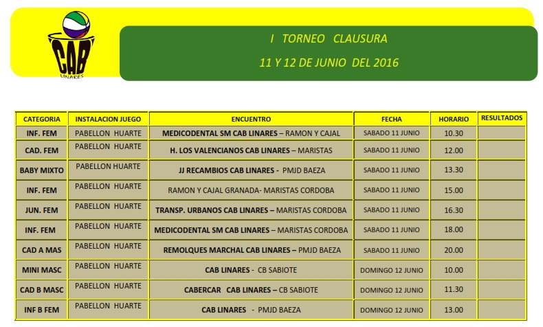 Los próximos días 11 y 12 de junio CAB Linares organiza, en colaboración con el Servicio de Deportes del Ayuntamiento de Linares y la Delegación en Jaén de la Federación Andaluza de Baloncesto, su I Torneo Clausura con el que buscamos poner fin a la competición para los equipos de nuestro club esta temporada. Tendremos el placer de recibir en Linares a Ramón y Cajal de Granada, Maristas Córdoba, Baloncesto Baeza y CB Sabiote.