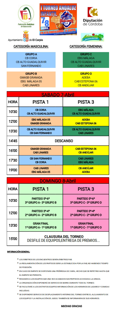 Durante el próximo fin de semana el Ayuntamiento de El Carpio y CB Alto Guadalquivir organiza junto con la Federación Andaluza de Baloncesto y la colaboración de la Diputación de Córdoba, la Mancomunidad de Municipios del Alto Gualdalquivir y el Ayuntamiento de Montoro un torneo de categoría infantil en el que reúnen a doce de los mejores equipos de Andalucía de la categoría y han tenido a bien invitar a nuestros equipos infantiles al mismo.
