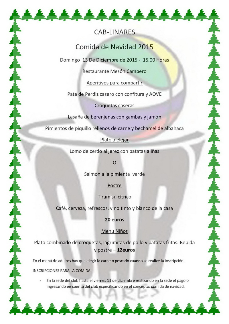El próximo día 13 de diciembre, a continuación de la presentación oficial de los equipos de nuestro club, de la que daremos información más detallada próximamente, nos vamos a reunir, como en años anteriores, para compartir un almuerzo con todos los socios, simpatizantes y familias que componemos CAB Linares.