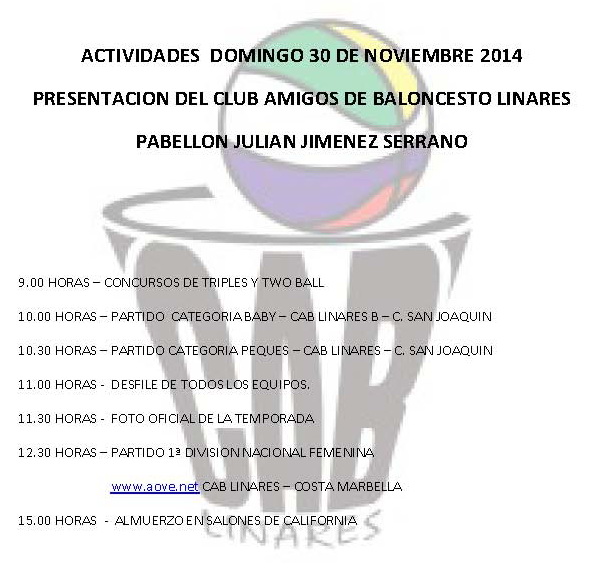 Actividades Presentación CAB Linares Categoría: Eventos 28 Noviembre 2014 Visitas: 3758 El próximo domingo se celebrarán diferentes actividades en el acto de presentación de nuestro club para la presente temporada 2014-2015. Toda la programación se muestra a continuación. Facebook X Anterior Siguiente
