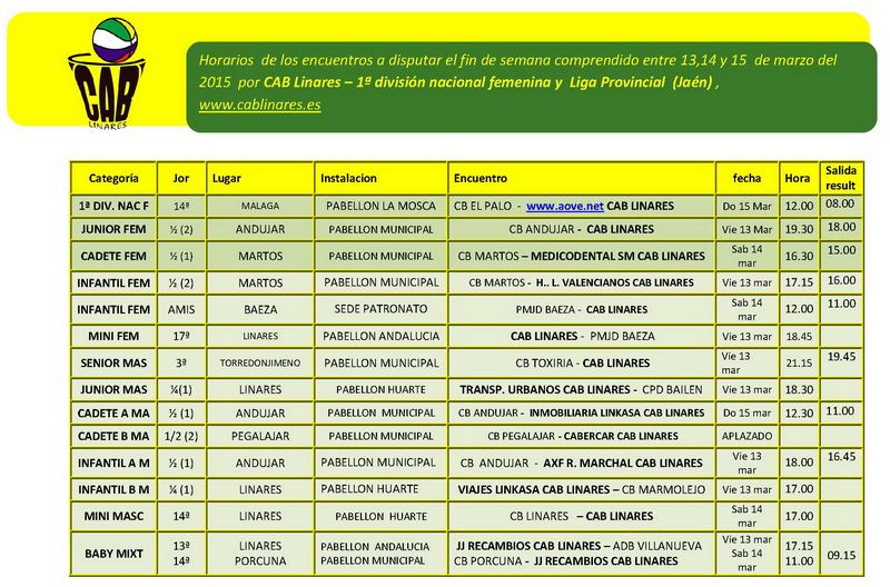 Las chicas infantiles se desplazarán el sábado por la mañana a Baeza a disputar un encuentro de carácter amistoso y los chicos y chicas baby del JJ Recambios CAB Linares se desplazan a Porcuna a disputar encuentro de liga regular. El sábado a primera hora de la tarde, el cadete femenino Medicodental SM CAB Linares se desplaza a Martos para comenzar la serie semifinal al mejor de tres y nuestro mini masculino disputa un interesante derby local en el Pabellón Huarte a las 17:00 h.