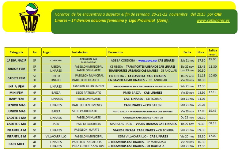 El sábado por la mañana el infantil masculino A Viajes Linkasa CAB Linares se enfrenta a CB Toxiria en el Pabellón Huarte. A continuación se disputará el encuentro de nuestro baby femenino ante mismo rival. El infantil femenino A Medicodental SM CAB Linares disputa en el Julián su encuentro ante Maristas y en la pista cubierta el baby mixto JJ Recambios CAB Linares se enfrenta a CB Toxiria. Por la tarde es el turno de nuestros equipos senior. El femenino de 1ªNacional Femenina www.aove.net CAB Linares viaja a Córdoba a disputar su encuentro ante ADEBA y los masculinos se enfrentan en casa a Bailén.