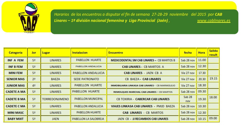 Comenzamos el viernes por la tarde con la disputa del encuentro mini femenino ante Jaén CB A y el junior masculino Inmobiliaria Linkasa CAB Linares ante Marmolejo, ambos en casa. El senior masculino se desplaza a última hora de la tarde a Baeza a disputar su encuentro aplazado de la 2ª jornada.