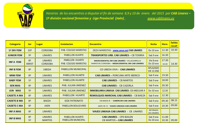 El domingo nuestro junior masculino Inmobiliaria Linkasa CAB Linares disputa su partido de la jornada ante CB Andújar en el Pabellón Julián Jiménez y el equipo de 1ª Nacional Femenina www.aove.net CAB Linares se desplaza a Córdoba a disputar su encuentro de liga ante DEZA Maristas Córdoba. A primera hora de la tarde, el conjunto infantil femenino A Medicodental SM CAB Linares disputará un encuentro de carácter amistoso ante Maristas de Córdoba.