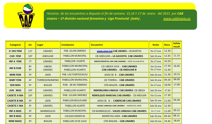 El sábado les toca madrugar a las chicas baby de Nuria que viajan a Torredonjimeno a disputar su encuentro de la jornada. El infantil masculino B y el cadete masculino B Carbecar CAB Linares se desplazan a Jaén para disputar sus encuentros ante Maristas y Jaén CB respectivamente. El cadete masculino C Viajes Linkasa CAB Linares disputa su encuentro en casa ante Maristas. El cadete femenino La Gaviota CAB Linares se desplaza a Andújar para disputar un partido importante de cara a la clasificación final de la categoría, donde hay mucha igualdad entre los favoritos al título. Las chicas del mini femenino visitan a Jaén CB en el Pabellón Fuentezuelas.